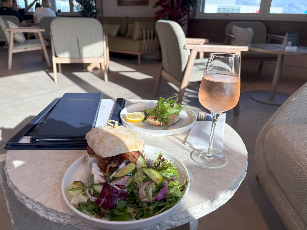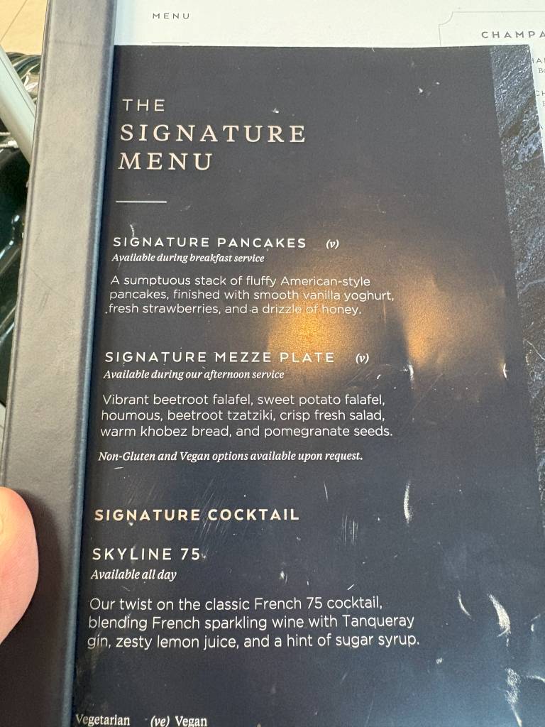Speisen gibt es in den Clubrooms ausschließlich à la carte. Auf der der Hauptspeisekarte beiliegenden Karte wurde ein Signature Menu angepriesen, welches neben einem Skyline 75 Cocktail fluffige Pancakes und eine Mezzeplatte enthielt. Mich haben eher die Speisen auf der Hauptkarte getriggert und so wählte ich an meinem „Cheat Day“ Krabbentoast und ein Bacon, Brie und karamellisiertes Zwiebel-Ciabatta. Auch Lasagne, Hähnchenbrust und ein Hoisin-Bao-Brötchen hätten meinem Magen gute Dienste geleistet.