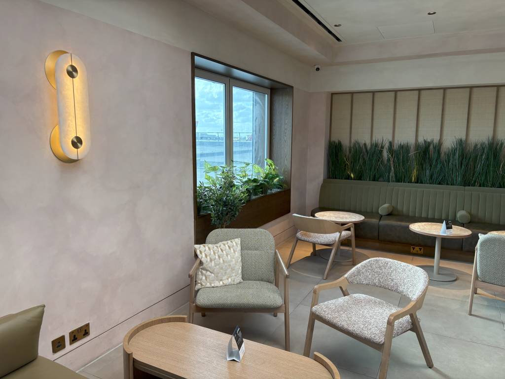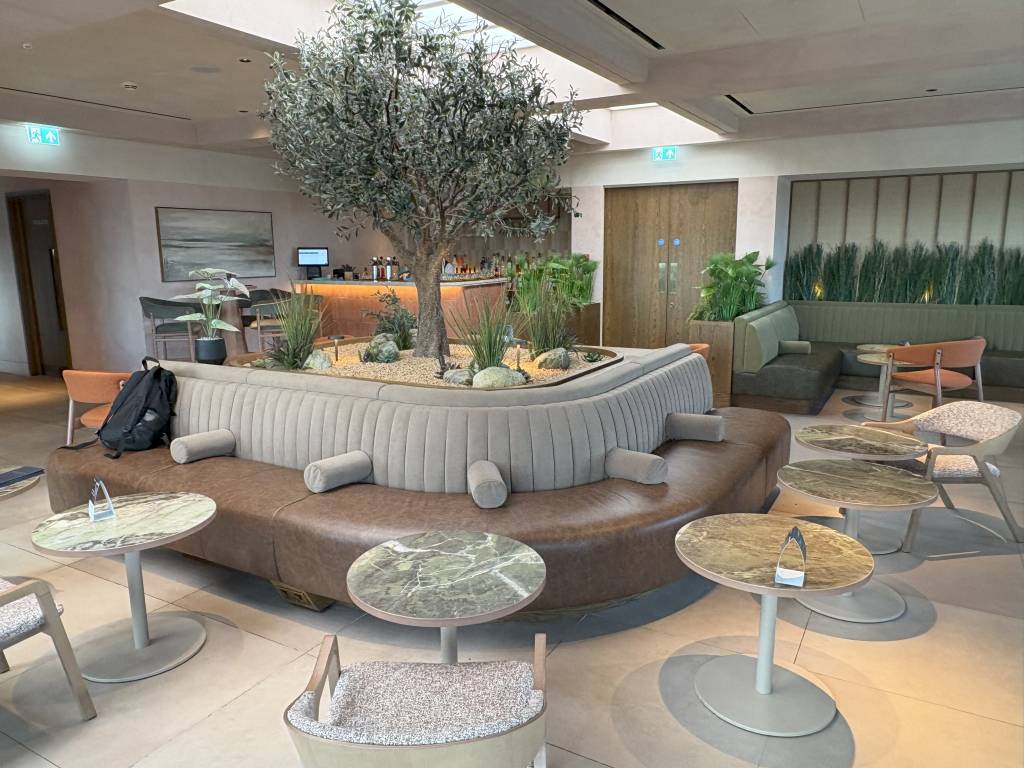 Zahlreiche Pflanzen, Kunstwerke an den Wänden und sorgfältig platzierte Dekorationselemente (z. B. Bücher, Lampen, Kissen) geben der Lounge Charakter und Individualität. Besonders der Bereich mit dem großen Olivenbaum als Mittelstück wirkt wie eine ruhige Oase mitten im Terminal.
