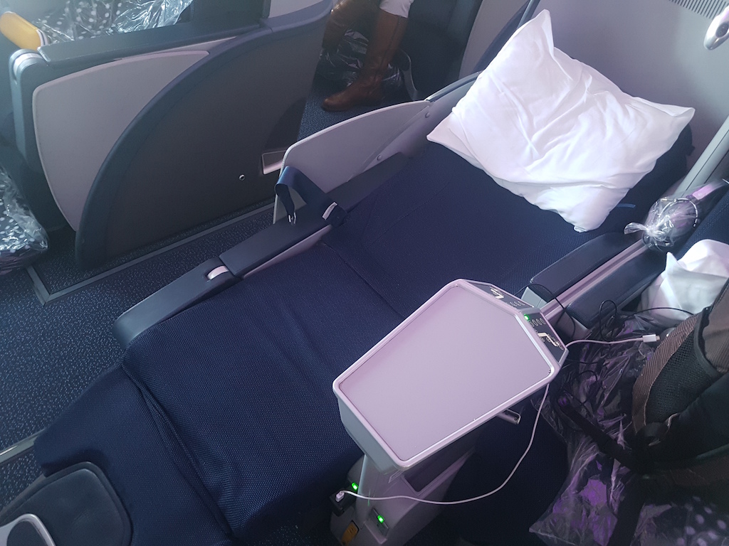 Die Sitzfläche ist zwar komplett flach, aber nicht parallel zum Boden. Das heißt, dass der Kopf deutlich über den Füßen liegt. Ich habe auf meinem Flug gute zwei Stunden geschlafen. Dabei habe ich einen Unterschied zu anderen Sitzen festgestellt. Persönlich finde ich es nicht schlimm, wenn mein Kopf etwas höher liegt, allerdings ist es auf Dauer unangenehm.