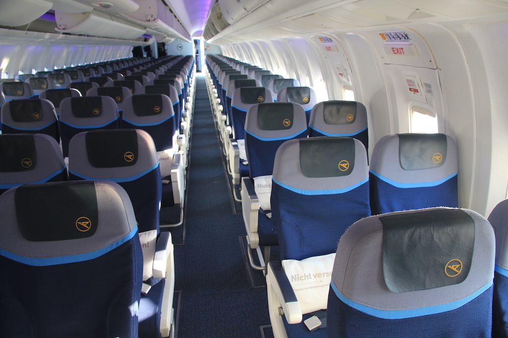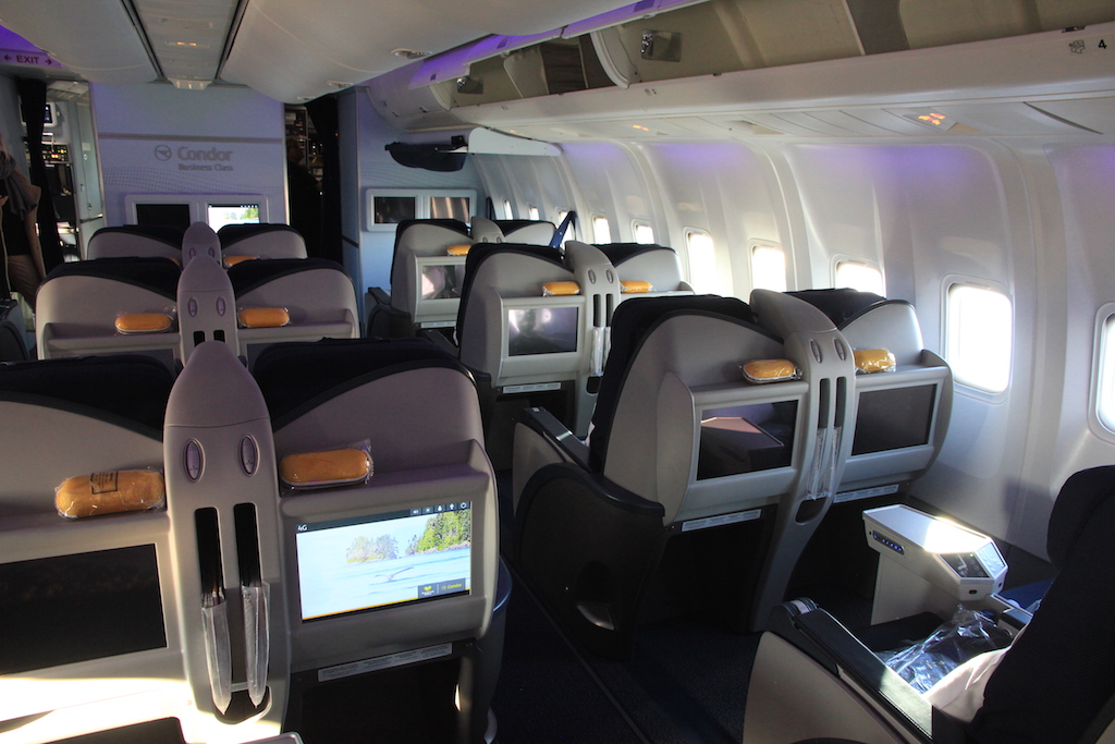 Die Kabine der Condor ist in drei Bereiche unterteilt. Vorn befindet sich die Business Class mit 30 Sitzplätzen. Diese ist in fünf Reihen mit jeweils sechs Sitzen verbaut.