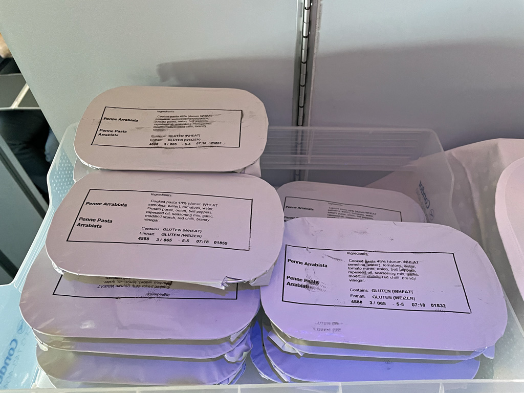 Kurz darauf begann die Essensausgabe in der Premium Economy. Nach zehn Minuten erreichten die Trolleys mit dem Essen die ersten Reihen der Economy Class.