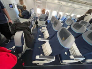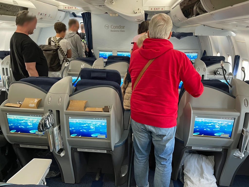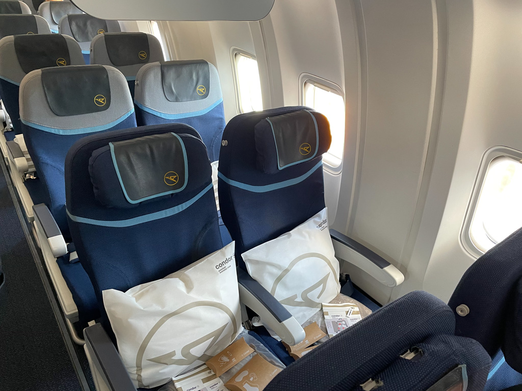 Die Boeing 767 von Condor haben in der Premium Economy und Economy Class eine 2-3-2 Konfiguration. Mit 79cm Sitzabstand sind sie noch auf dem alten Standard und deswegen ein wenig komfortabler als bei den Flugzeugen mit der neueste Generation von Sitzen, bei denen es oft nur noch 76cm Abstand gibt.
