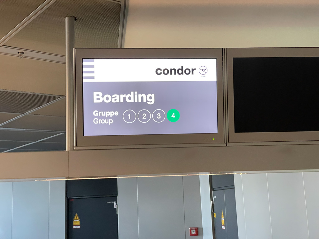 Das Boarding startete pünktlich und war nach Gruppen organisiert. Noch vor dem ersten Aufruf zum Boarding wurden schon einzelne Passagiere zum Flugzeug durchgelassen. Die auf den Bordkarten gedruckte Gruppennummer (1, 2, 3 oder 4) wurden kontrolliert und wer zu früh ins Flugzeug wollte, wurde konsequent abgewiesen.
