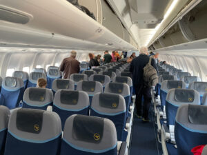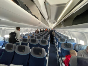 Die große Überraschung kam dann an Bord: Die Klimaanlage lief noch nicht (ausreichend stark). Und es ist unglaublich, wie schnell sich so eine Metallröhre in der Sonne (mit immer mehr Passagieren drin) aufheizt. Da ging es schon vor Abflug tropisch zu.