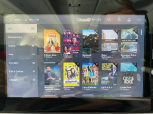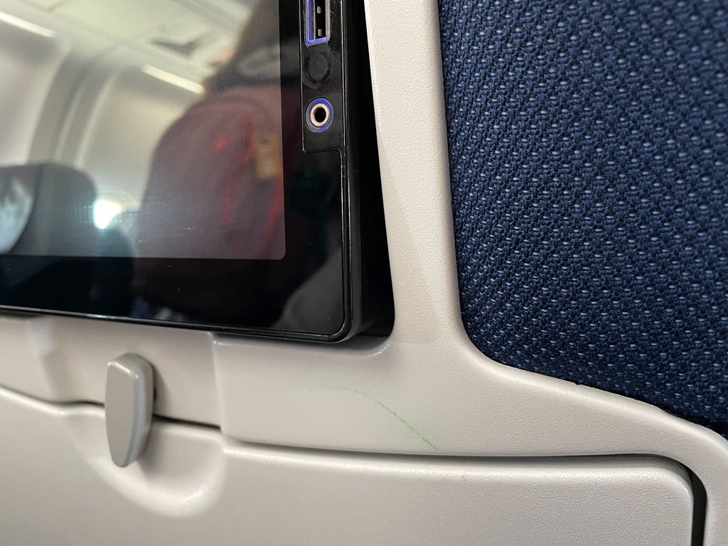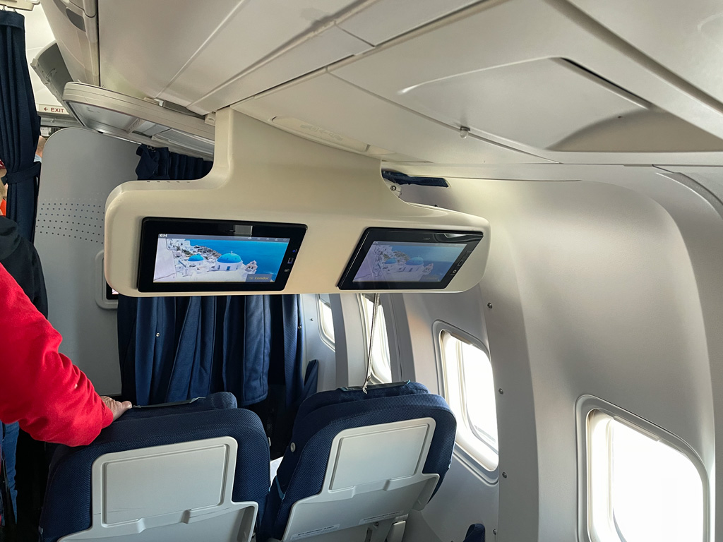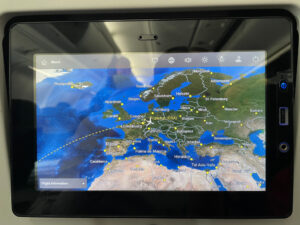 In den Vordersitzen ist ein Touchscreen eingebaut. Damit kann man während des Fluges das Entertainmentsystem bedienen und sich die Zeit vertreiben. Kopfhörer muss man selbst mitbringen oder 3,90 Euro kleine In-Ear-Kopfhörer kaufen.