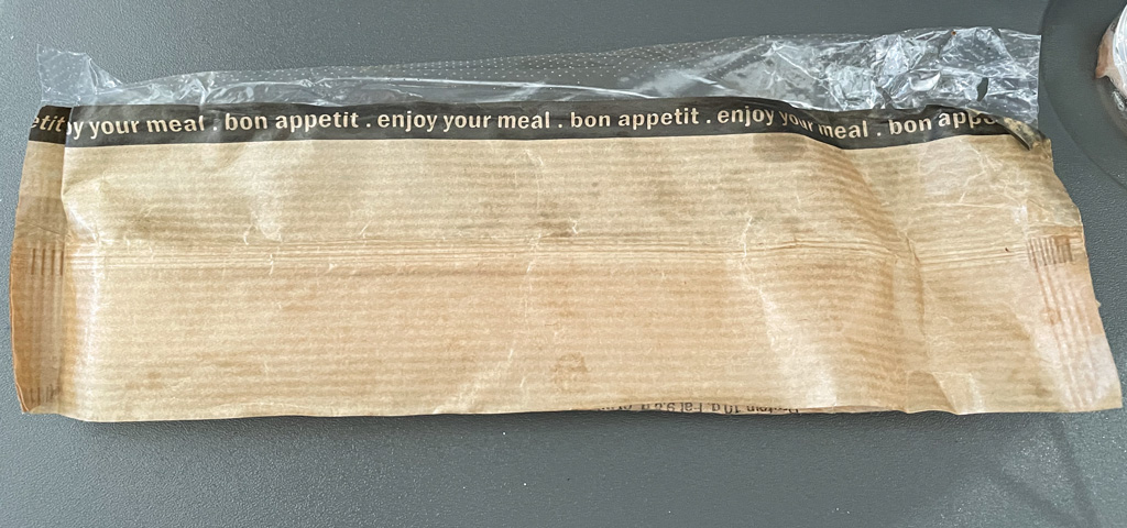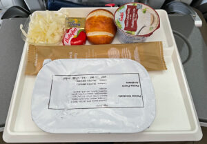 Zwei Stunden vor der Landung wurde das zweite warme Essen verteilt. Es gab Pizzarollen. Pro Gast eine, gefüllt mit Tomatensauce und Käse. Geschmacklich waren die Pizzarollen in Ordnung und ein wenig gesättigt haben sie auch.
