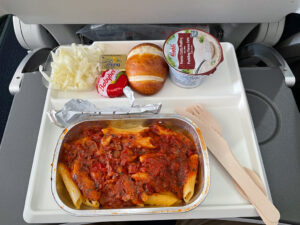 Es gab Penne Arrabiata für alle. Oder halt nicht. Die Portionen waren dabei minimal und ich wäre nicht satt geworden, hätte ich nicht noch annähernd zwei Portionen von den Kindern übernehmen können. Geschmacklich waren es eher Nudeln mit Tomatensauce, von der Schärfe einer ordentlichen Arrabiata-Sauce war nichts zu schmecken. Das darf jedoch nicht verwundern, denn Schärfe ist nichts für alle Reisenden und so muss die Airline dann ein Kompromisessen anbieten.