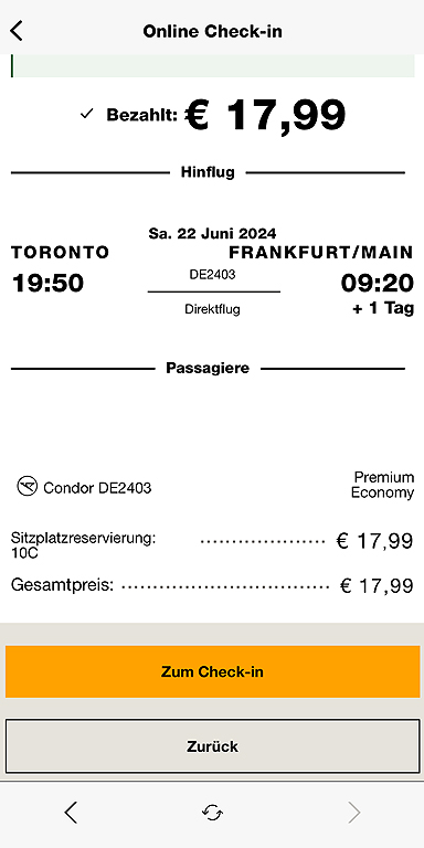 Der Check-in kann ab 24 Stunden vor Abflug per App oder auf der Condor Website vorgenommen werden. Wunschsitzplätze sind auch zu diesem Zeitpunkt noch kostenpflichtig. Allerdings gibt es hier eine große Vereinfachung: Alle Sitzplätze kosten „nur“ noch 17,99 Euro.