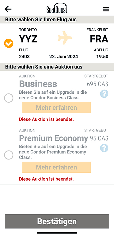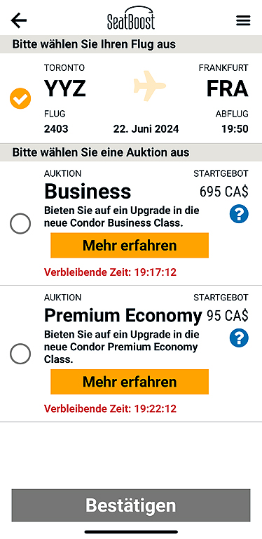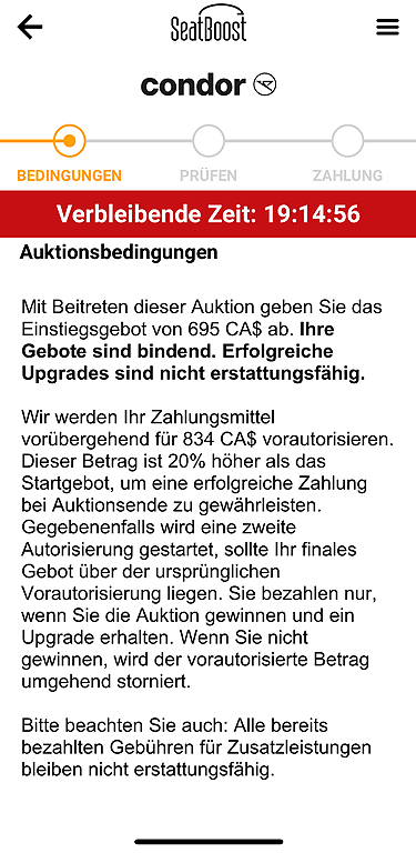 Zusätzlich nutzt Condor die Firma Seatboost, um bis kurz vor Abflug noch Upgrades in Form einer Auktion zu verkaufen. Dazu könnt Ihr in der Seatboost App Eure Flugdaten eingeben und seht dann, wie hoch die Mindestgebote sind. Ihr könnt dann die gewünschte Reiseklasse auswählen, denkt Euch einen Bieternamen (der für alle sichtbar ist) aus, und hinterlegt schließlich noch Eure Kreditkartendaten mit dem Gebotsbetrag.