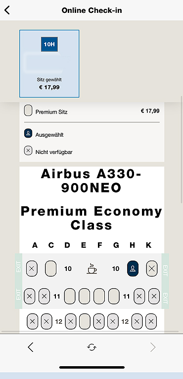 Da noch XL-Sitze zu Verfügung standen und ich zum Schlafen gerne meine Gräten ausstrecken wollte, gönnte ich mir einen der vorderen Sitze für 17,99 Euro. Wer die nicht zahlen möchte, kann auch ohne Sitzplatzreservierung online einchecken oder damit bis zum Flughafencheck-in warten.