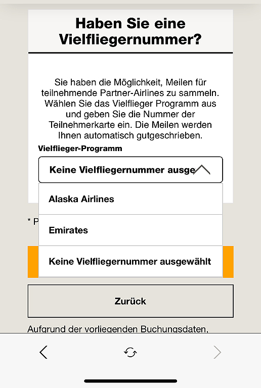 Immerhin kann man im Online Check-in inzwischen problemlos die Meilennummern von Alaska Airlines oder Emirates hinterlegen.