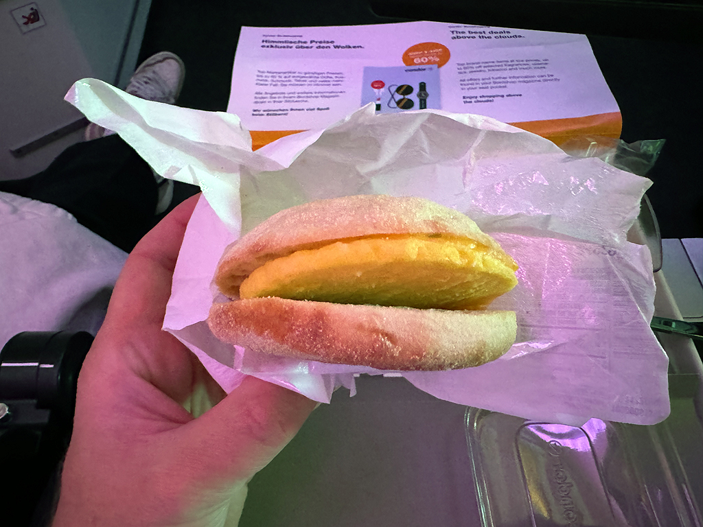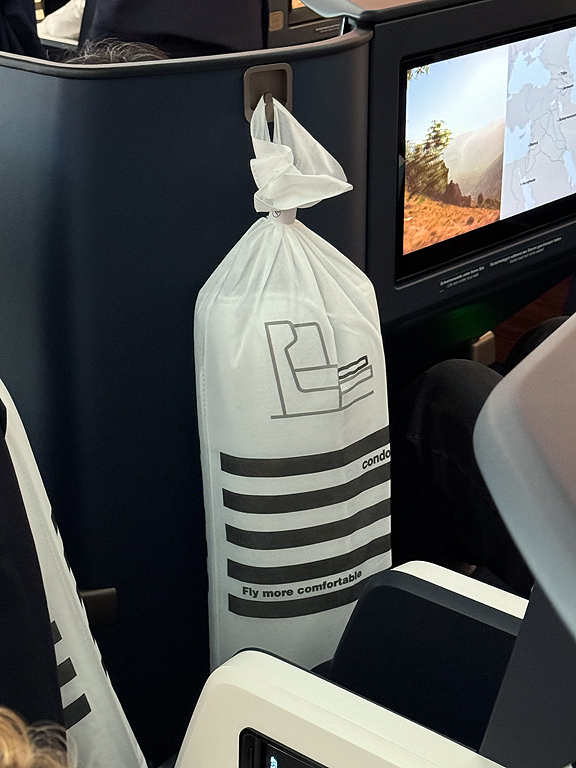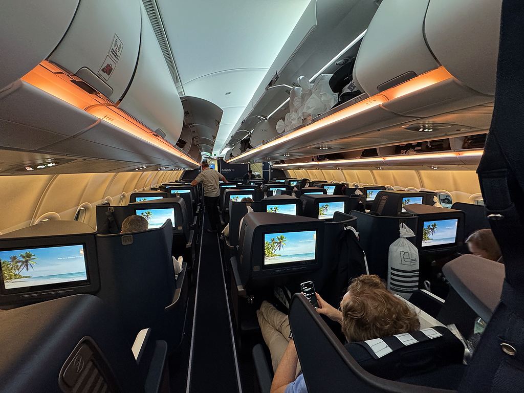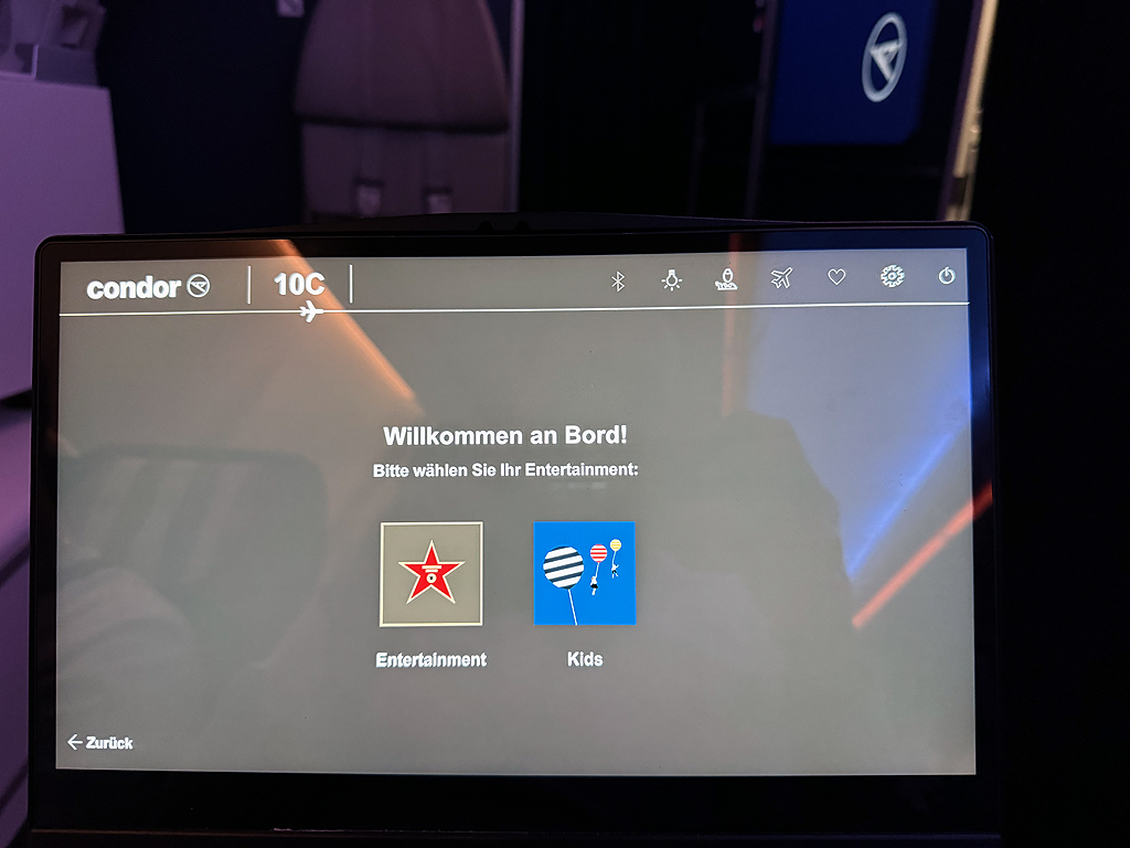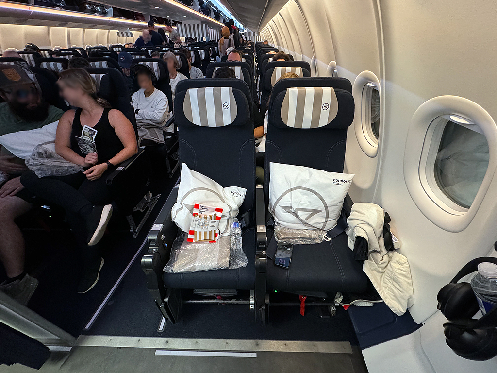 – Es gibt keine Baby-Bassinets auf der Condor A339. Das kann für viele ein Vorteil sein, ist aber ehrlich gesagt ein Problem, wenn es im Vorfeld nicht hinreichend kommuniziert wurde und Passagiere dann ein Baby für 12 h auf den Schoss nehmen müssen (so passiert einige Reihen hinter uns bei einem Elternpaar)