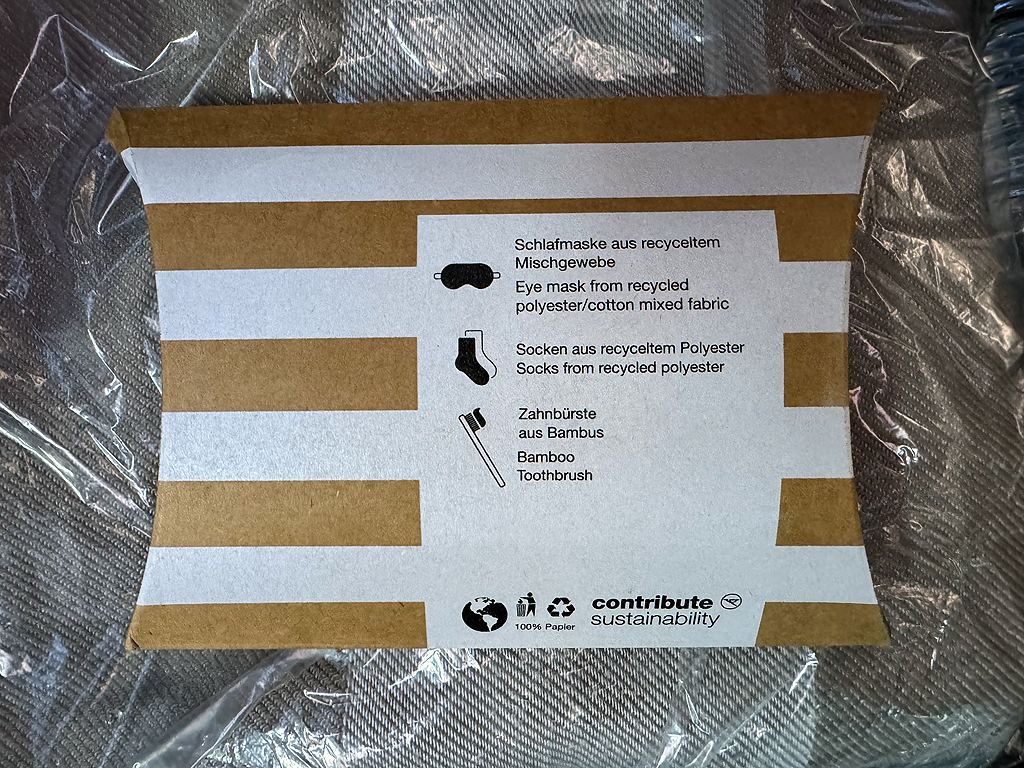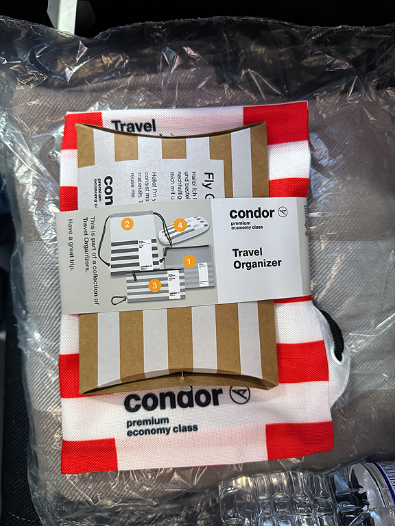 In der Premium Economy Class verteilt Condor Amenity Kits. Natürlich sind sie gestreift. Ich bekam einen kleinen rot-weiß gestreiften Beutel, an dem eine kleine Pappschachtel befestigt war. In der Schachtel fand ich eine Zahnbürste mit Zahnpasta, eine einfache graue Schlafmaske (mit weißen Streifen) und grau-weiß geringelte Flugzeugsocken. Zusätzlich lag noch ein Kärtchen bei, auf dem mir mitgeteilt wurde, dass ich bei der Crew nach Ohrstöpseln fragen könne.