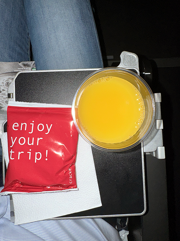 Eine gute halbe Stunde nach dem Start verteilte die Crew ein Tütchen Cracker und Getränke an die Reisenden in der Premium Economy Class. Ich entschied mich für einen Orangensaft.