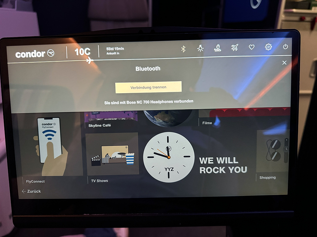 Was mir in Erinnerung bleiben wird: Condor hat USB-C Buchsen im Sitz verbaut. Ich konnte daher mein Smartphone mit rund 15W laden.