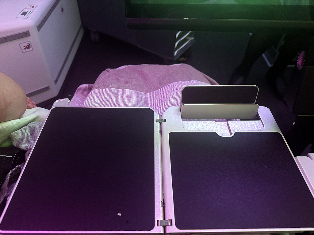 Ein kleines Highlight ist der funktionale Tisch. Ganz ausgeklappt ist er groß genug für das Essenstablett. Wenn man ihn der Breite nach halbiert, ist er schmal genug, dass man aus dem Sitz aufstehen kann. Außerdem ist ein Handy/Tablethalter in den Tisch integriert, sodass Ihr eigenen Content sehen könnt, ohne dass Euch die Arme taub werden.