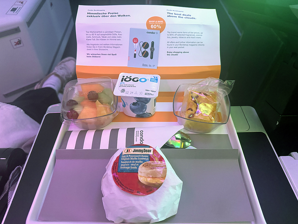 Vom Service war ich insgesamt angetan. Zwar ist er nicht sonderlich persönlich, dafür jedoch voll professionell und effizient. Gerade auf kurzen Nachtflügen ist es schön, wenn der Essensservice zügig durchgeführt wird, damit die Erholungszeit nicht unnötig verkürzt wird. Das hat Condor geschafft. Auch die vielen Getränkerunden waren positiv. Die letzte gute Überraschung war die Flasche Wasser kurz vor der Landung. Damit können sich viele Passagiere den Stop im teuren Flughafenshop sparen.
