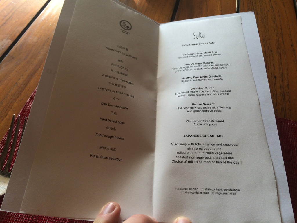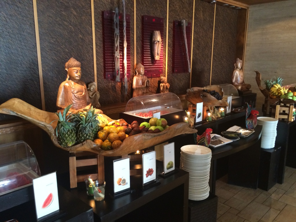 Wer nicht im Suite Bereich übernachtet, oder Zugang aufgrund seines Diamond Status hat, kann das Frühstück im Suku Restaurant unter der Lobby einnehmen. Dabei handelt es sich um ein sehr umfangreiches Frühstücksbuffet mit westlichen und asiatischen Gerichten. Auch einige Speisen können aus einer kleinen Karte bestellt werden. Auch eine sehr umfangreiche Auswahl an Getränken kann bei den Kellnern bestellt werden. Dabei handelt es sich um die selbe Getränkeauswahl wie beim Afternoon Tea im Suite Bereich.