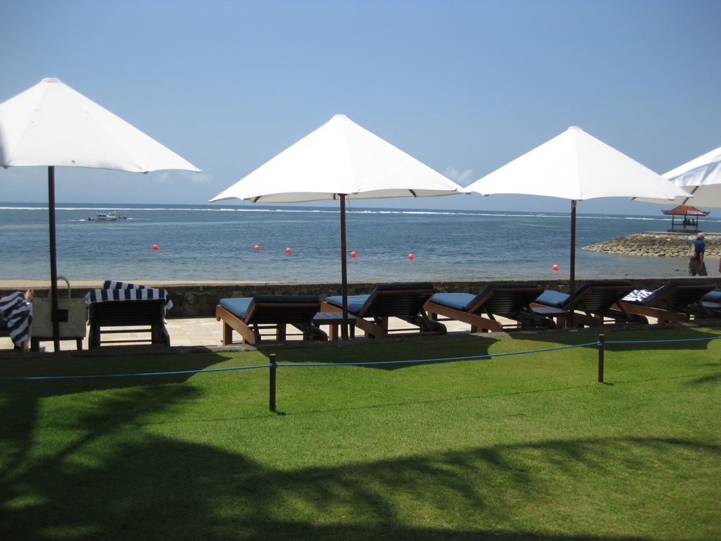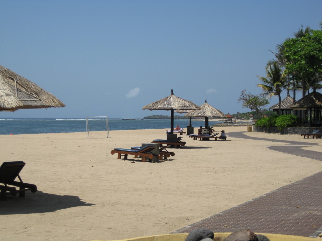 Direkt vor dem Resort befindet sich ein Sandstrand. Dieser wird vom Hotel in einem sehr guten Zustand gehalten. In Bali gibt es grundsätzlich keine privaten Strände. Daher kann es sein, dass man am Strand von fliegenden Händlern oder Masseurinnen angesprochen wird. Das Hotelpersonal achtet allerdings sehr genau darauf, dass die Gäste nicht belästigt werden. Auch Wasser, Handtücher und Liegen werden vom Hotel am Strand zur Verfügung gestellt.
