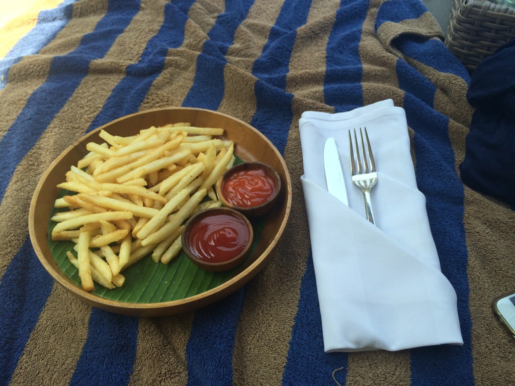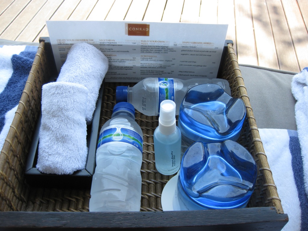 Um den Pool sind einige überdachte Cabbanas aufgestellt. Auch befinden sich Liegen mit Sonnenschirmen am Ende des Pools. Was diesen Pool immer so angenehm machte war, neben dem Sorbet am Mittag und dem recht schnellen WLAN, auch der Korb mit kalten Tüchern, Wasser und Antimückenspray. Wer am Pool Hunger bekommt, kann etwas von der kleinen Karte bestellen.