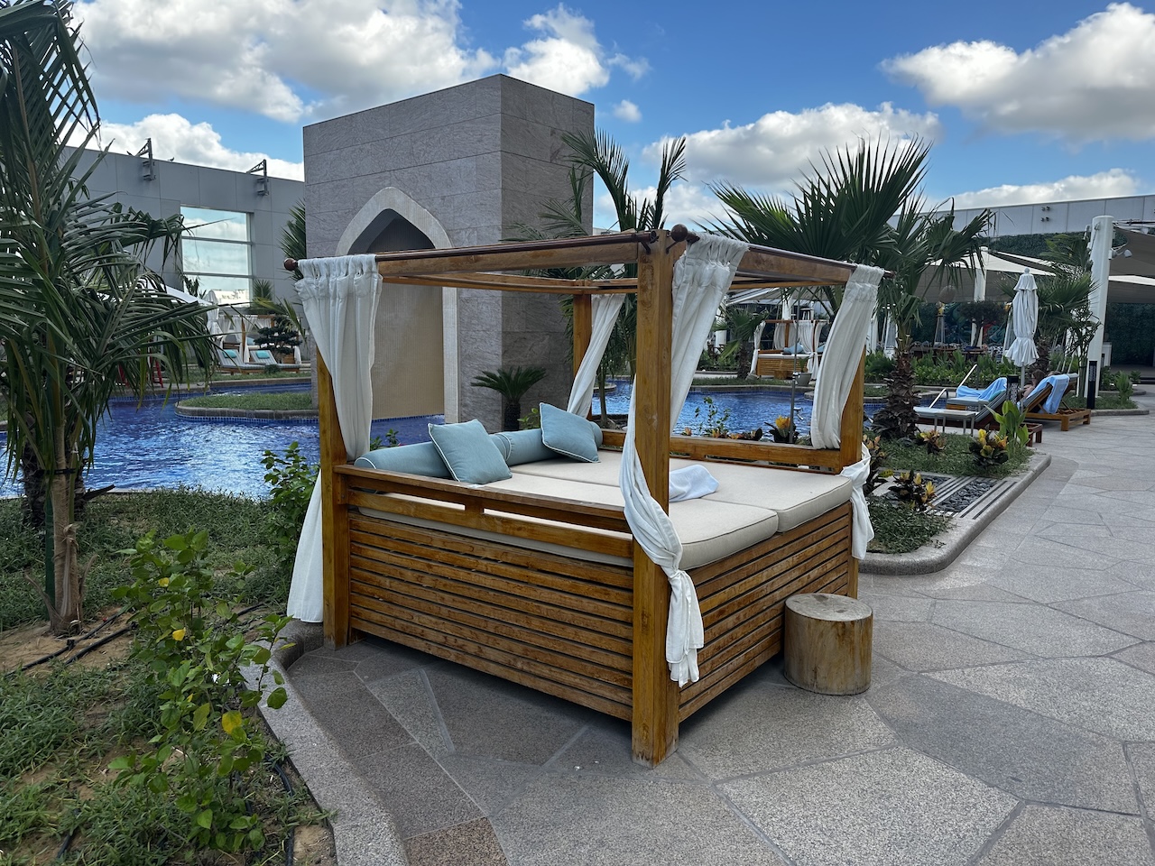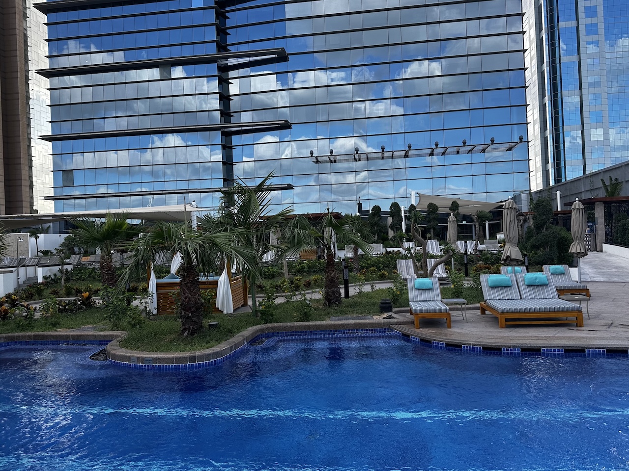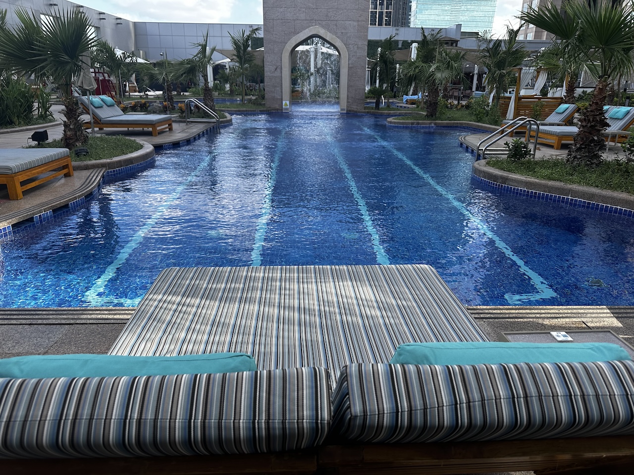 Am diesem Morgen im Dezember war es draußen noch nicht sehr heiß, der Poolbereich war entsprechend leer. Auch im Winter ist dies ein sehr beliebter Aufenthaltsbereich bei vielen Gästen, da man trotz der zentralen Lage des Hotels kaum etwas von der Straße oder dem Großstadtlärm mitbekommt. Im Gegensatz zu vielen US-Hotels sind die großen Betten und Komfortliegen nicht kostenpflichtig. Hier herrscht das Prinzip „First come, first serve“.