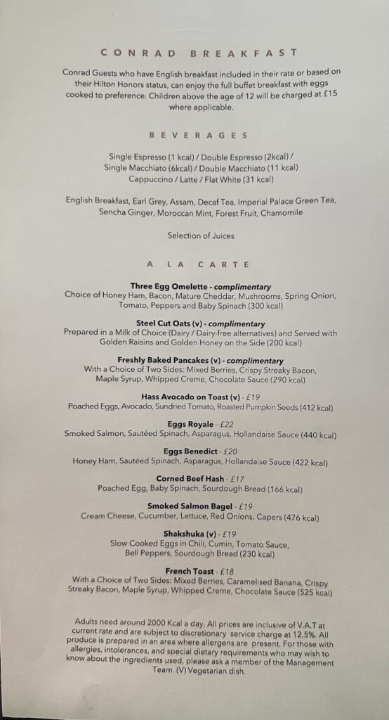 Das Conrad spielt in London in der oberen Liga der Hotels, wobei es natürlich auch noch deutlich exklusivere und wesentlich teurere Häuser gibt. Hier muss man für eine Nacht meist 300-400 Euro auf den Tisch legen, manchmal gibt es Angebote oder Pakete mit Benefits, gelegentlich explodieren die Preise auch in diesem Hotel.