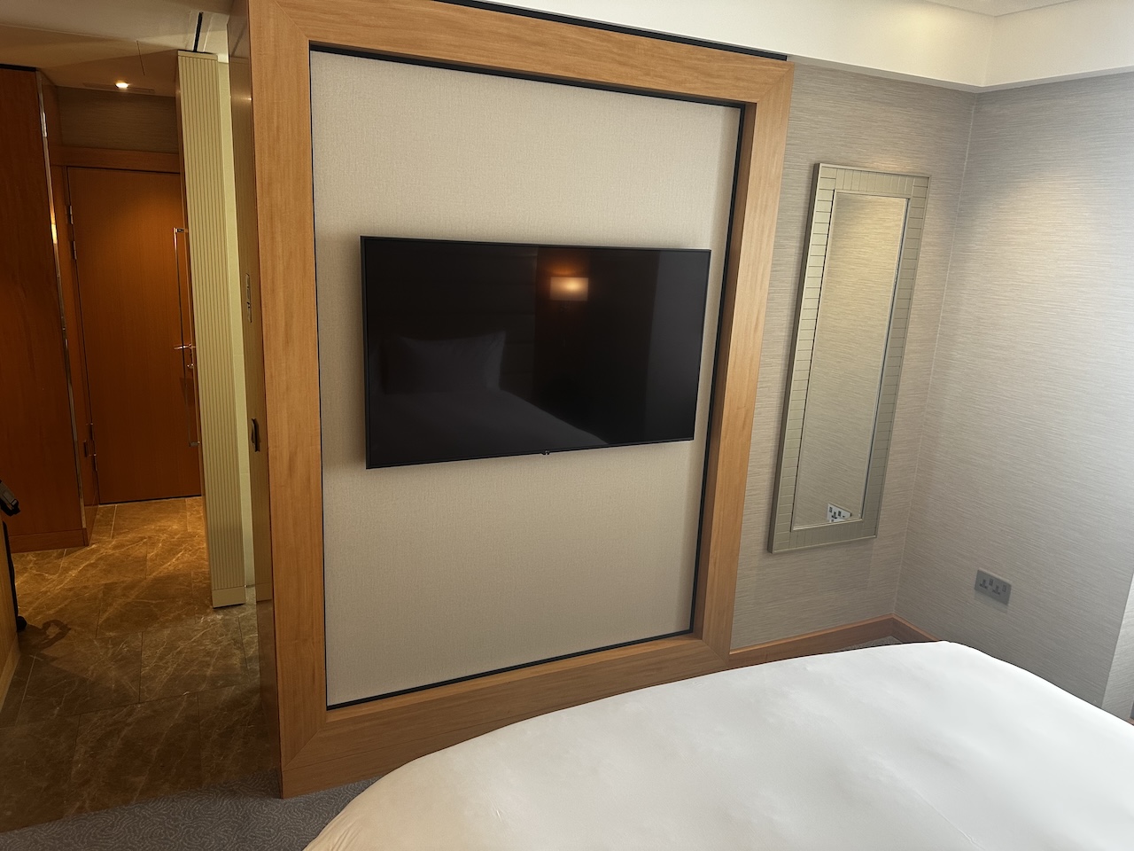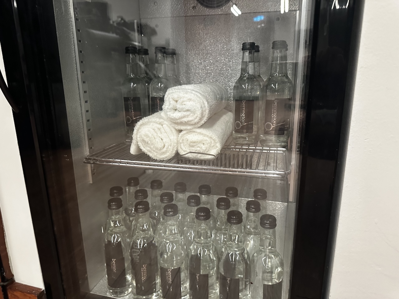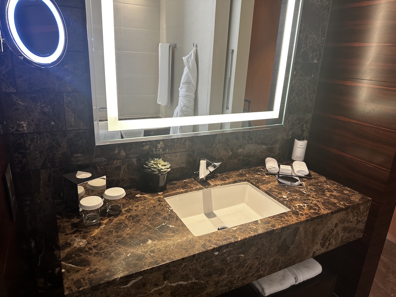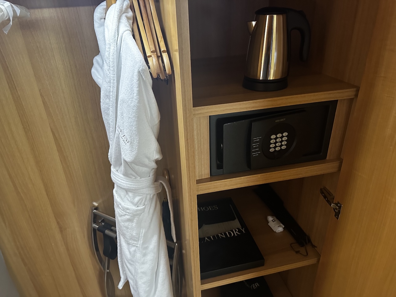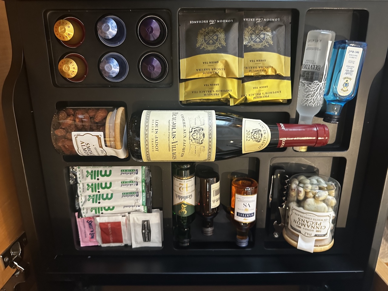 Das Zimmer hatte einen etwas größeren Eingangsbereich mit Ablageflächen, eine Ecke mit Schreibtisch. Zu der Ausstattung gehören auch Minibar, Espressomaschine, Wasserkocher, Safe, Bademäntel und viele andere Dinge, die man in einem Luxushotel erwarten würde.