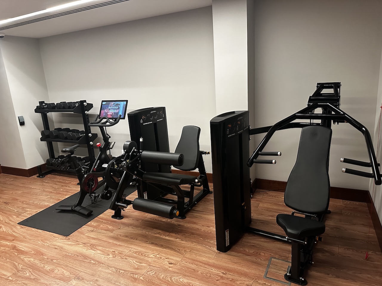Im Keller ist ein kleines Fitnessstudio versteckt, hier gibt es neben den Geräten und Hanteln auch einen Waschraum und Schließfächer. Insgesamt ist alles etwas eng geraten, zumindest wird es ab etwa drei Personen schon gefühlt voll.