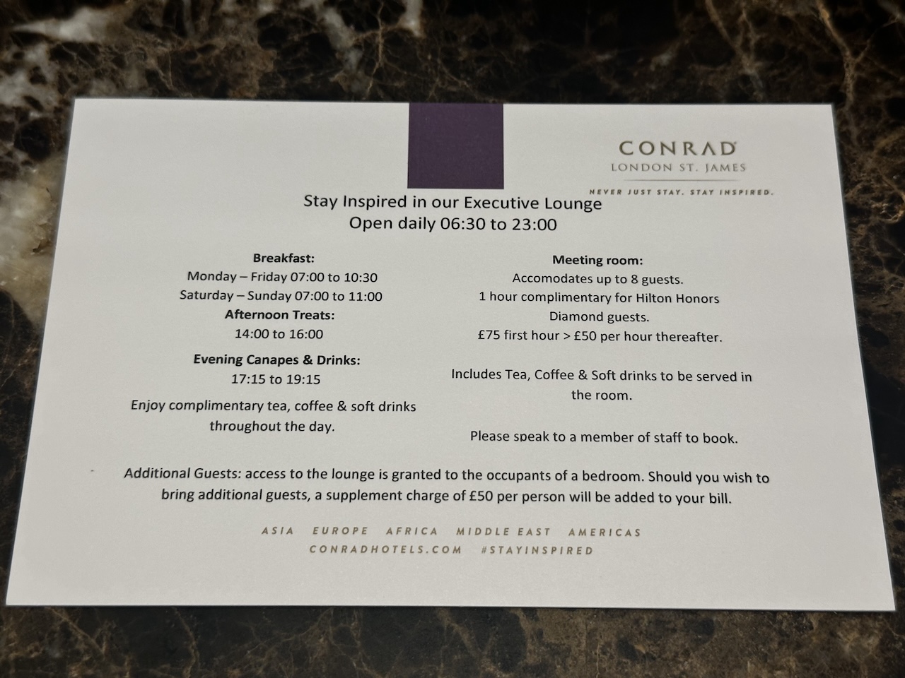 Die Executive Lounge befindet sich im ersten Stockwerk, diese ist mit der Zimmerkarte zugänglich. Das Programm wurde mir am Check in ausgehändigt, darin Informationen zu den Zeiten und dem Angebot.