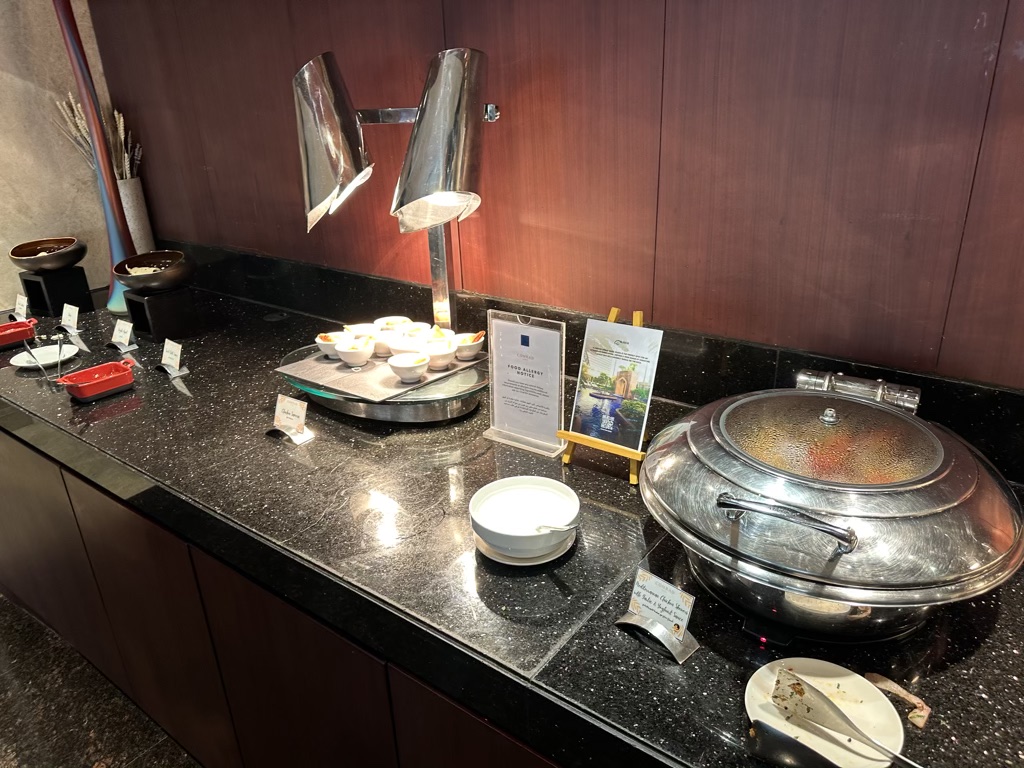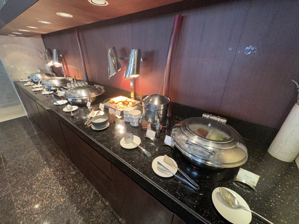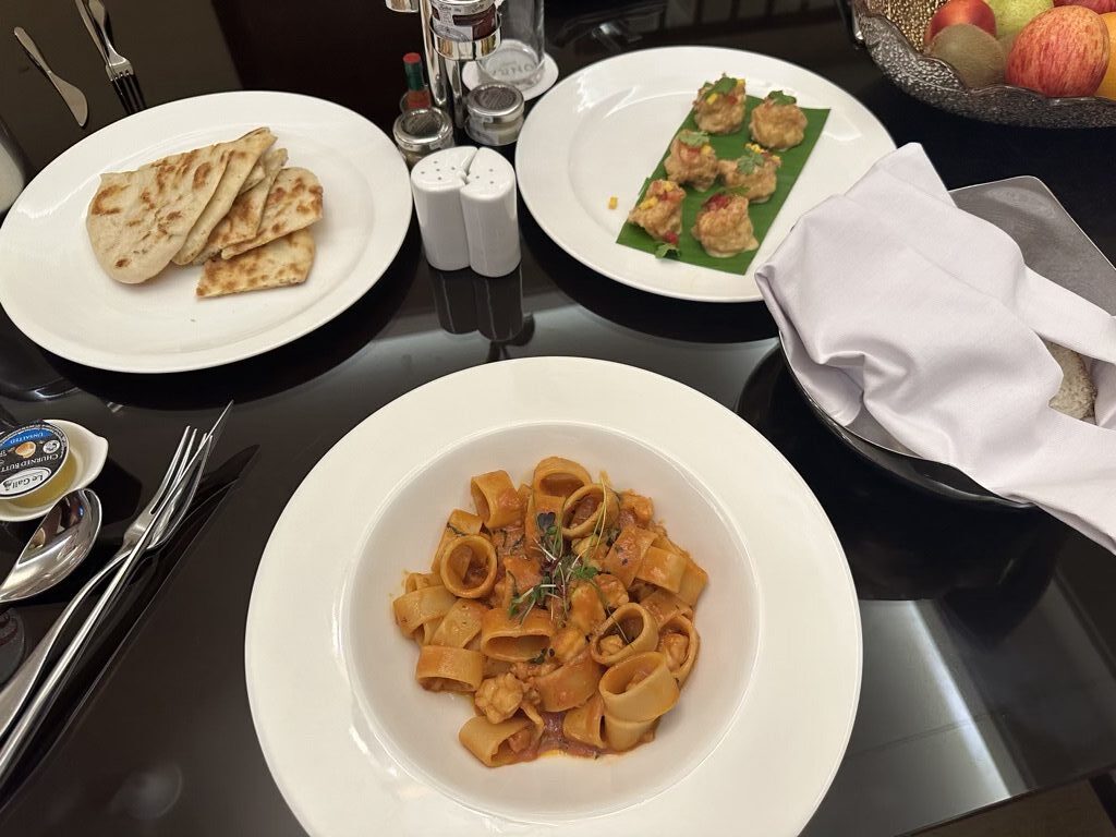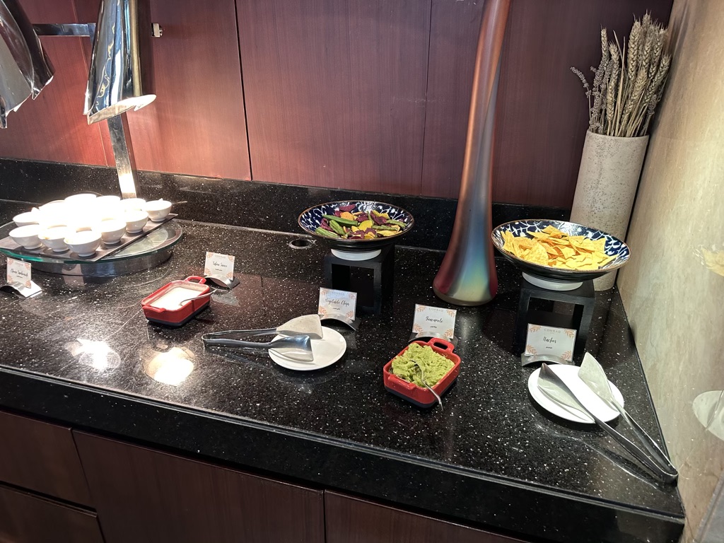 Die Lounge bietet nicht nur das bereits ganztags Softdrinks und das beschriebene Frühstück und an, sondern am Nachmittag kann man auch Snacks zu sich nehmen und zwischen 18-10 Uhr findet eine Happy Hour statt, bei der alkoholische Getränke ausgeschenkt werden. Hier gibt es dann ein für Loungeverhältnisse sehr ordentliches Buffet an warmen und kalten Speisen und eine Bedienung erfüllt nahezu alle Getränkewünsche. Das Buffet ist so üppig, dass man, wenn man nicht besonders wählerisch ist, ein vollwertiges Abendessen zu sich nehmen kann. Wir haben hier nicht zu sehr zugeschlagen, da wir noch das In Room Dining testen wollten.