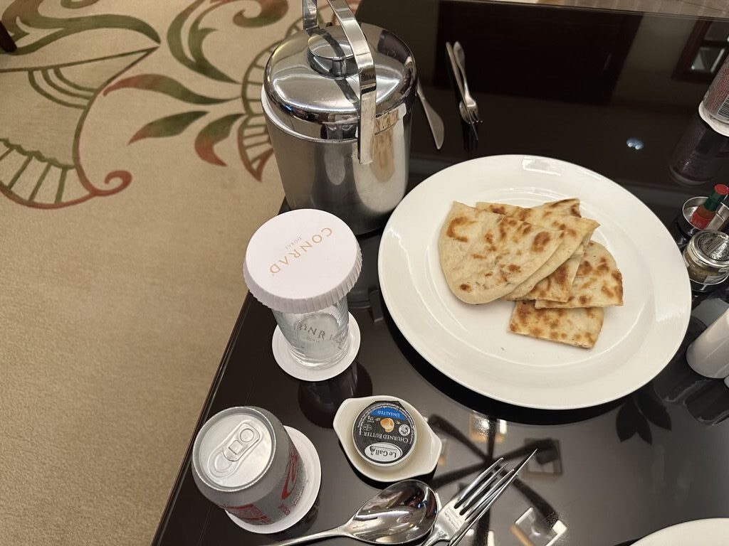 Wie ich oben beschrieben haben, waren wir schon sehr oft im Conrad Dubai. Manchmal in der Hauptsaison, aber auch schon mehrfach in der absoluten Nebensaison. Immer mit Hilton Honors Diamond Status, aber bisher immer ohne Impresario Rate. Dieses krasse Zimmerupgrade hat mich fast aus den Latschen gehauen, ich war schwer beeindruckt. Die Preise in Hotels sind oft gesalzen, Schnäppchen kann man auch am Pool oder im Restaurant oder In-Room Dining bei Conrad nicht schlagen, aber durch das Hotelguthaben von 100 US$ haben wir uns völlig ohne schlechtes Gewissen Drinks zum Pool und In-Room Dining für zwei bestellt, alles im Budget.
