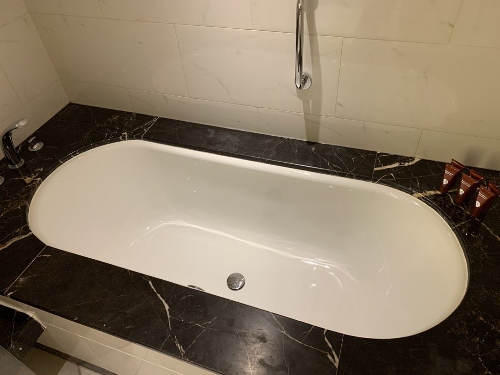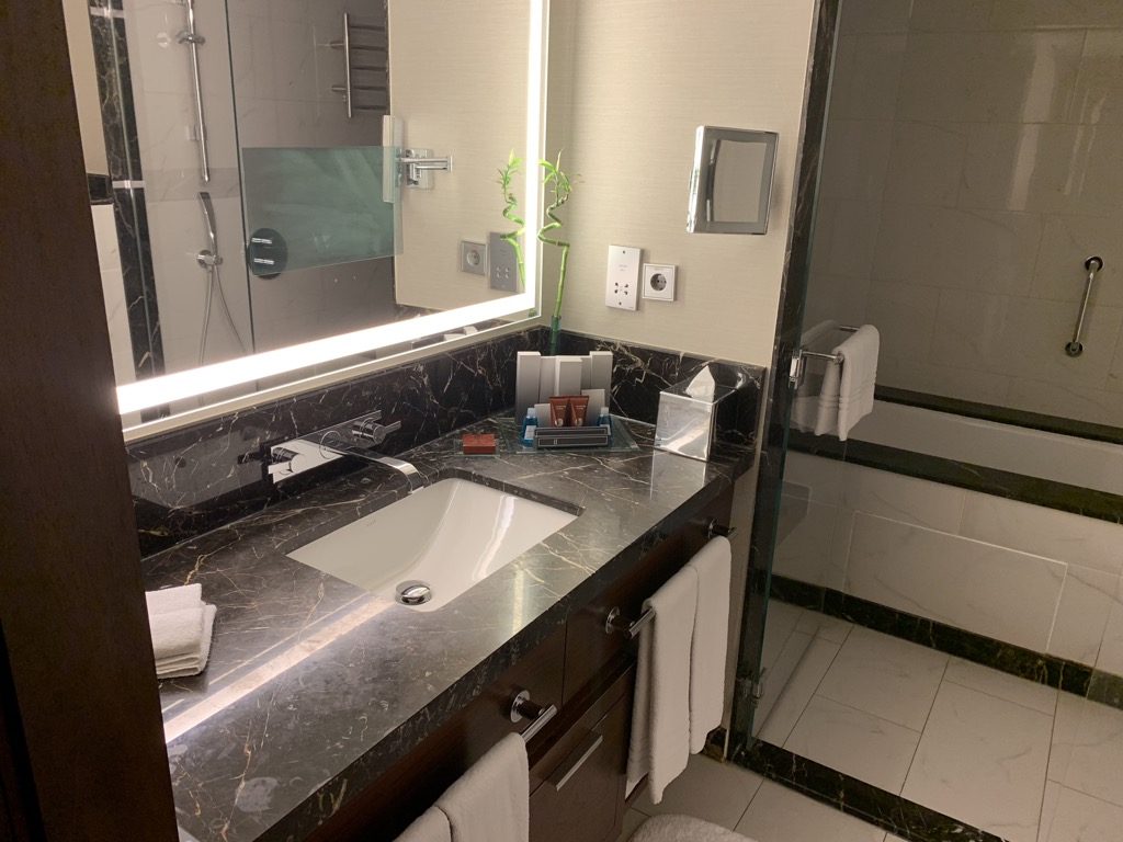 Neben dem Schlafzimmer befinde sich das große Bad, welches in weißem Marmor gehalten ist. Neben der Badewanne gibt es auch eine große Regenkopfdusche, welche interessanterweise mit der Badewanne eine Einheit bildet. Dies scheint in Hotels immer beliebter zu werden, aber ich selbst bin kein Fan davon.