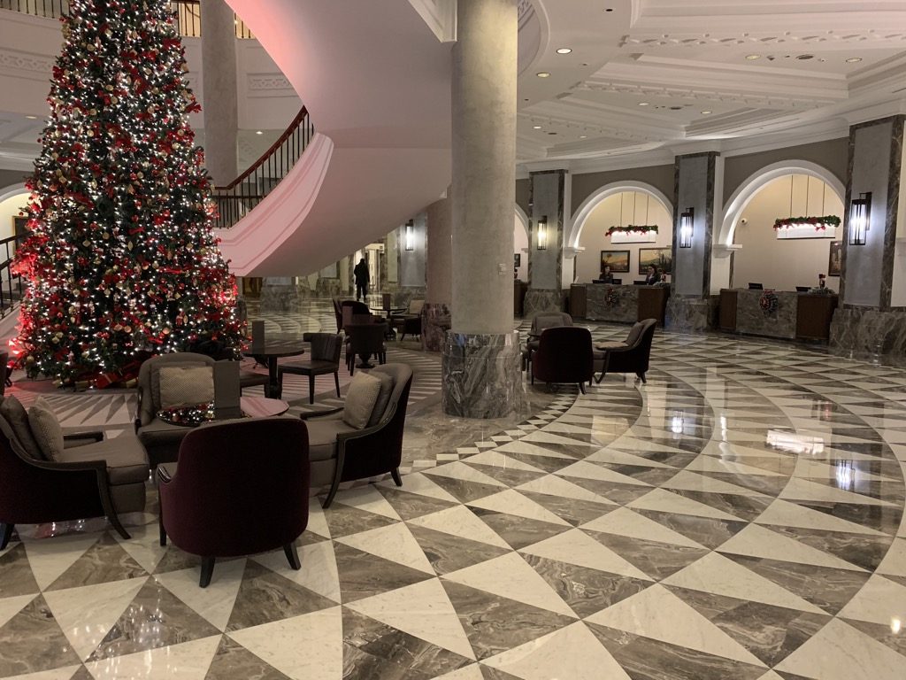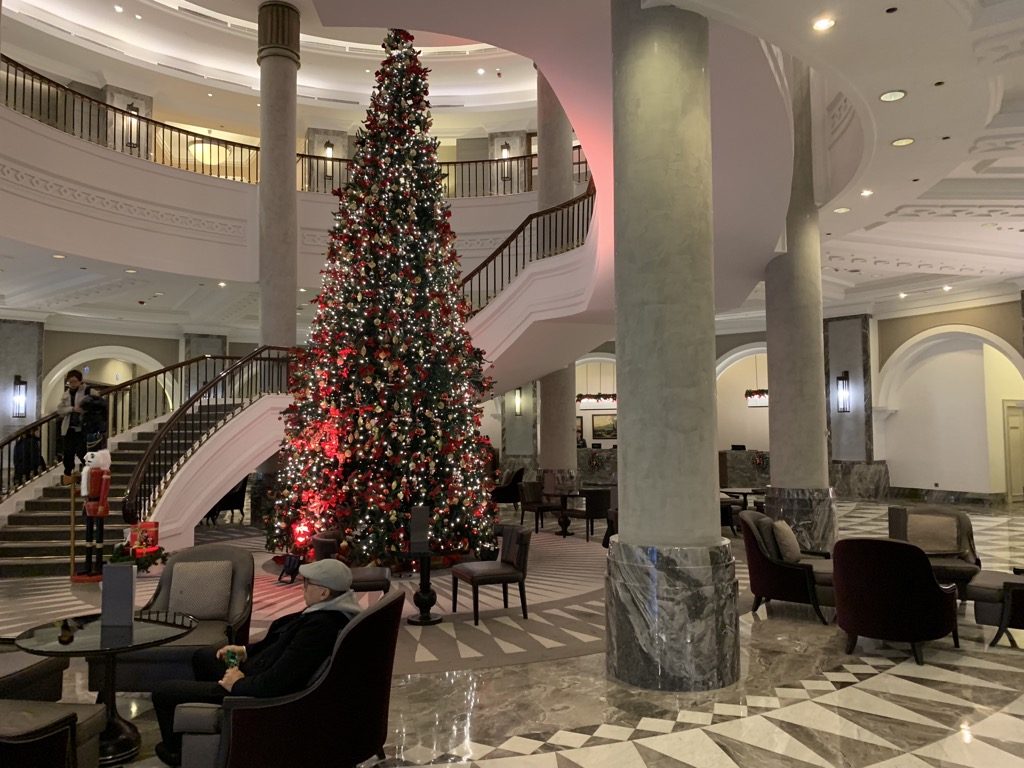 Nach einer kurzen Sicherheitskontrolle stand ich auch schon in der kleinen eleganten Lobby, in welcher mich passend zur Jahreszeit kurz vor Weihnachten ein großer Weihnachtsbaum begrüßte.