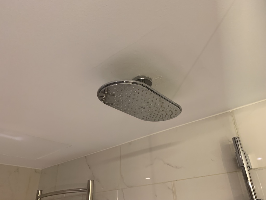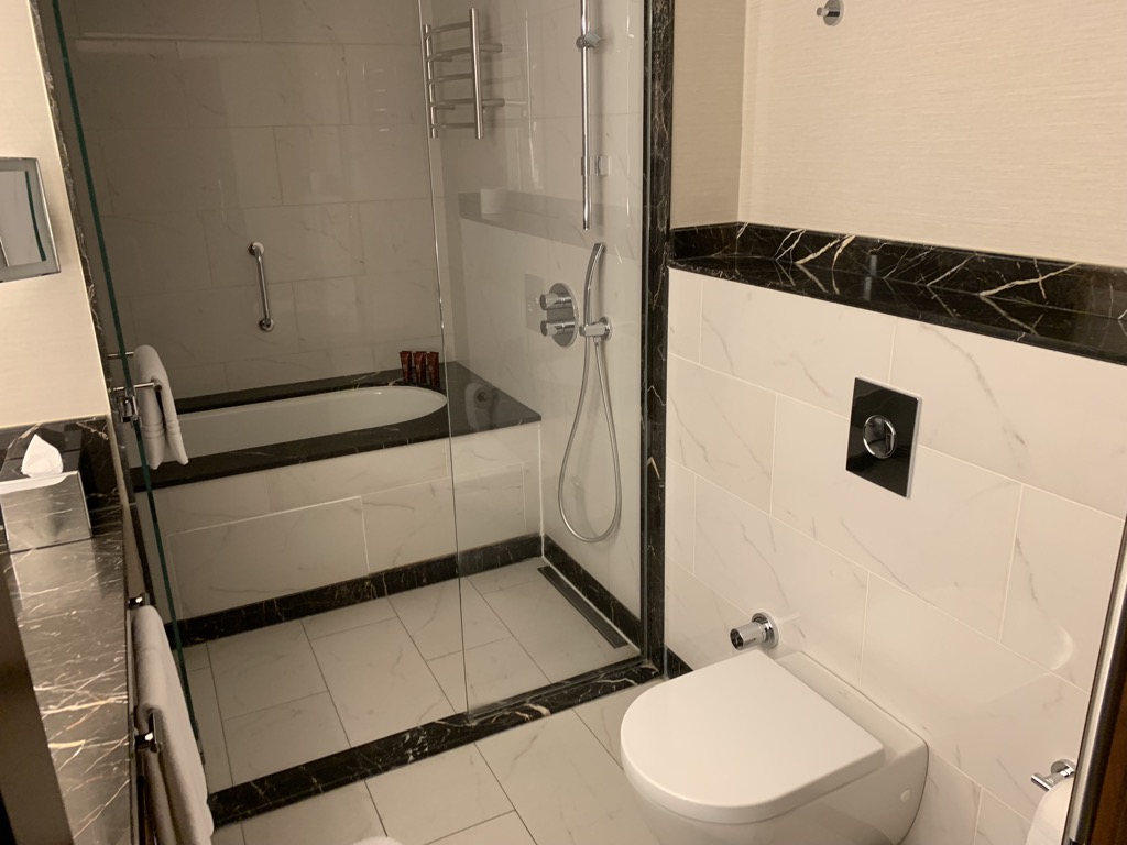 Neben dem Schlafzimmer befinde sich das große Bad, welches in weißem Marmor gehalten ist. Neben der Badewanne gibt es auch eine große Regenkopfdusche, welche interessanterweise mit der Badewanne eine Einheit bildet. Dies scheint in Hotels immer beliebter zu werden, aber ich selbst bin kein Fan davon.