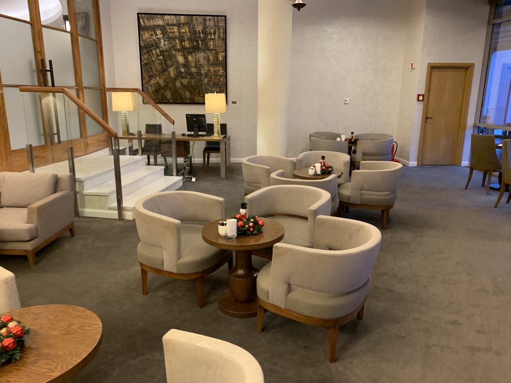 Nach einer kurzen Sicherheitskontrolle stand ich auch schon in der kleinen eleganten Lobby, in welcher mich passend zur Jahreszeit kurz vor Weihnachten ein großer Weihnachtsbaum begrüßte.