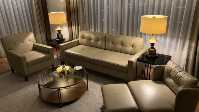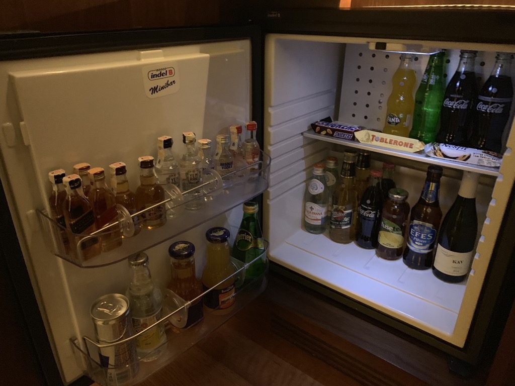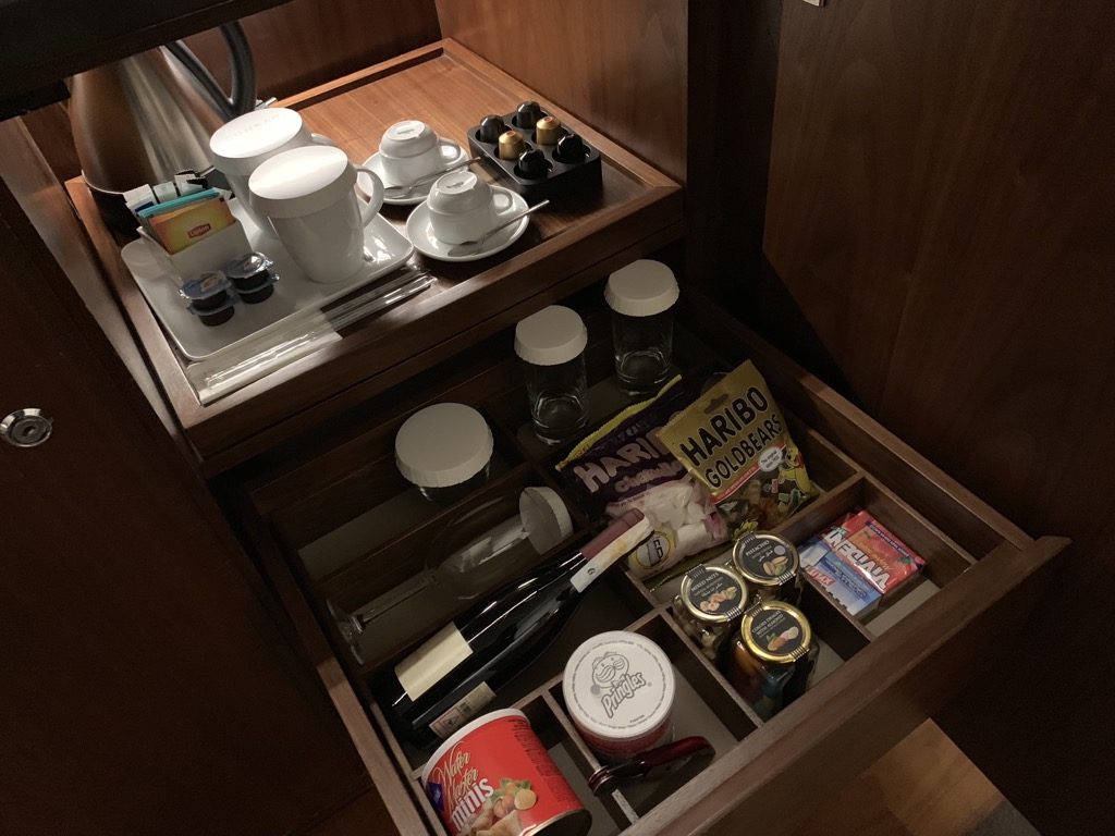 Im Wohnzimmer befindet sich auch die Minibar und die Nespresso Kaffeemaschine. Während der Kaffee und das Wasser natürlich kostenlos sind, sind die Preise in der Minibar extrem hoch, was mich überrascht hat, denn selbst die Preise im Room Service sind sehr günstig für europäische Verhältnisse.
