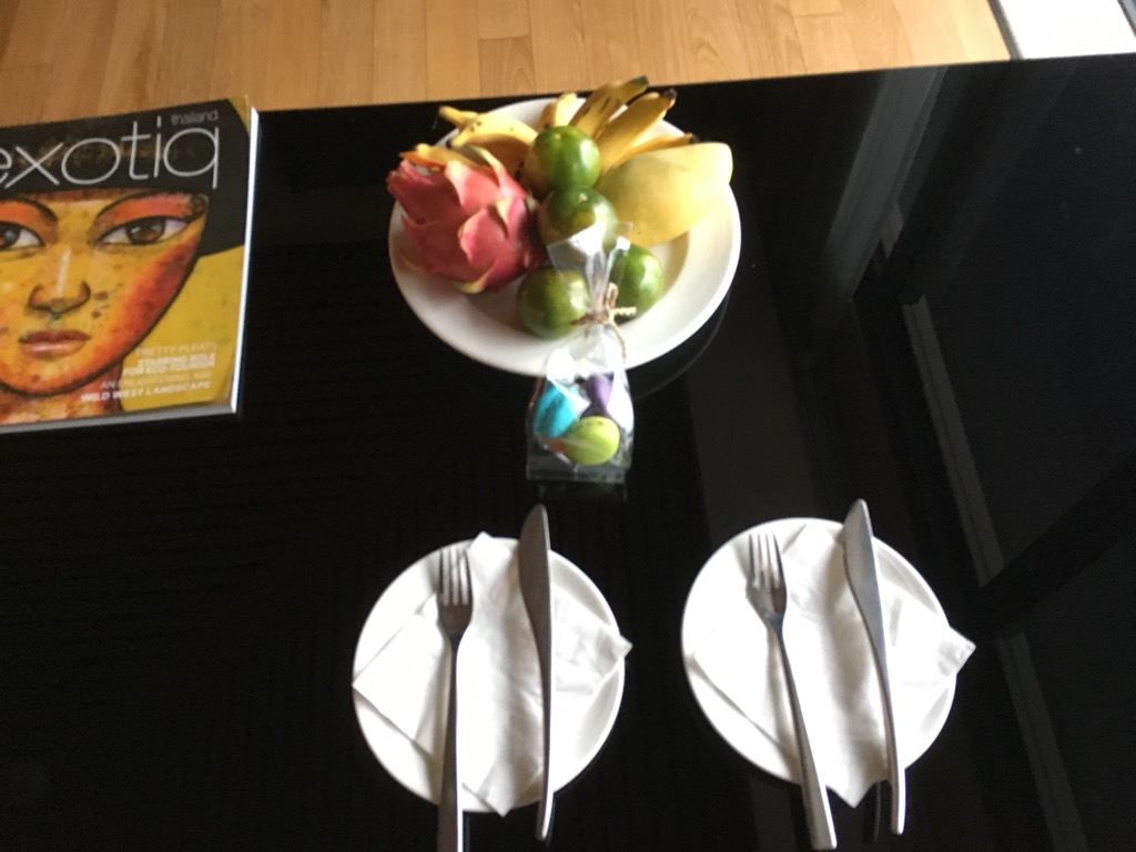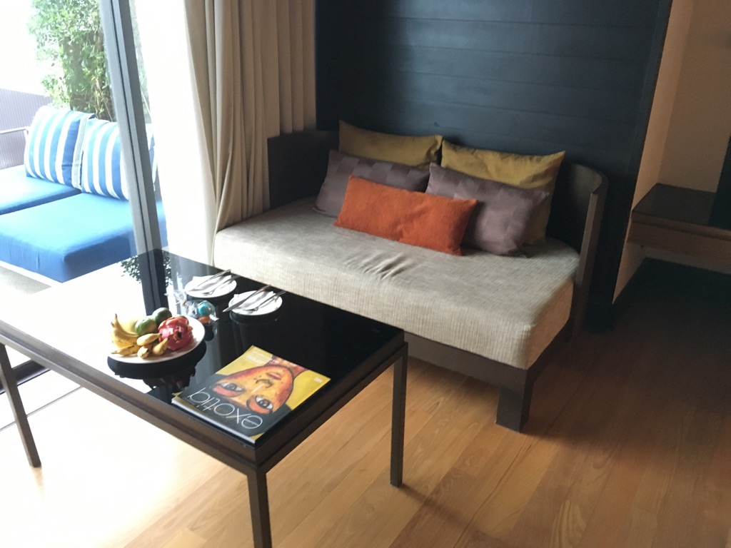 Hinter dem Schreibtisch befand sich eine Wohnecke mit einer Couch, einem Couchtisch, einem großen Fernseher und der Minibar. Hier wurden wir von einem Teller mit frischem Obst begrüßt. Die Villa ist mit ausreichend kostemfreien Wasser ausgestattet. Tee und Kaffee war auch, wie üblich, kostenfrei.