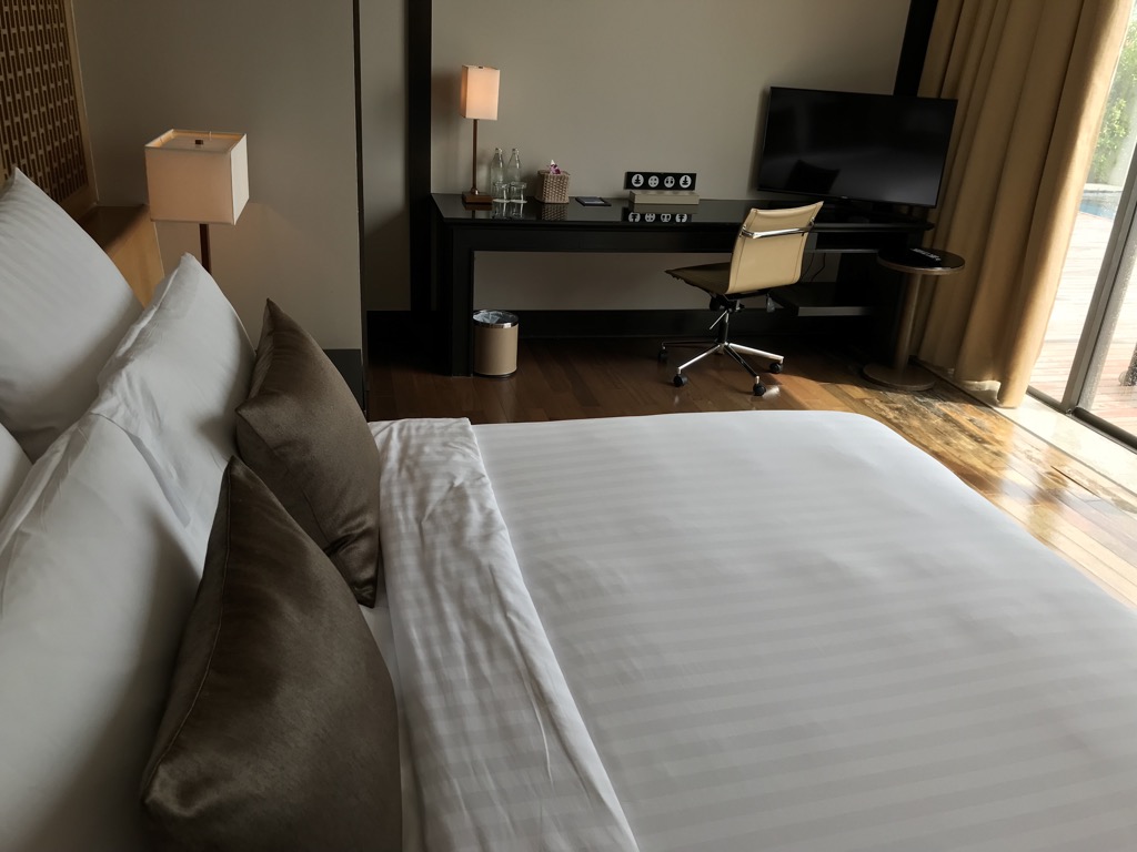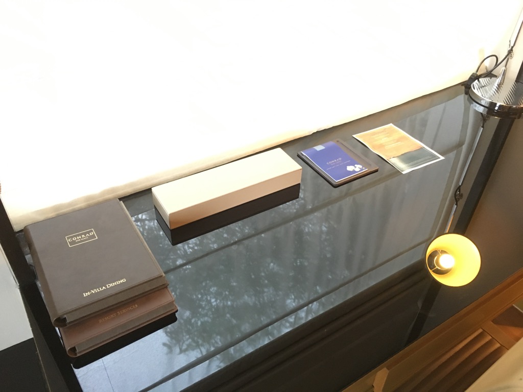 Neben dem Bett befand sich ein Schreibtisch, auf dem nicht nur einige Hilfsmittel zum Arbeiten gelagert waren, sondern auch noch die üblichen Informationen wie In-Room Dining etc.