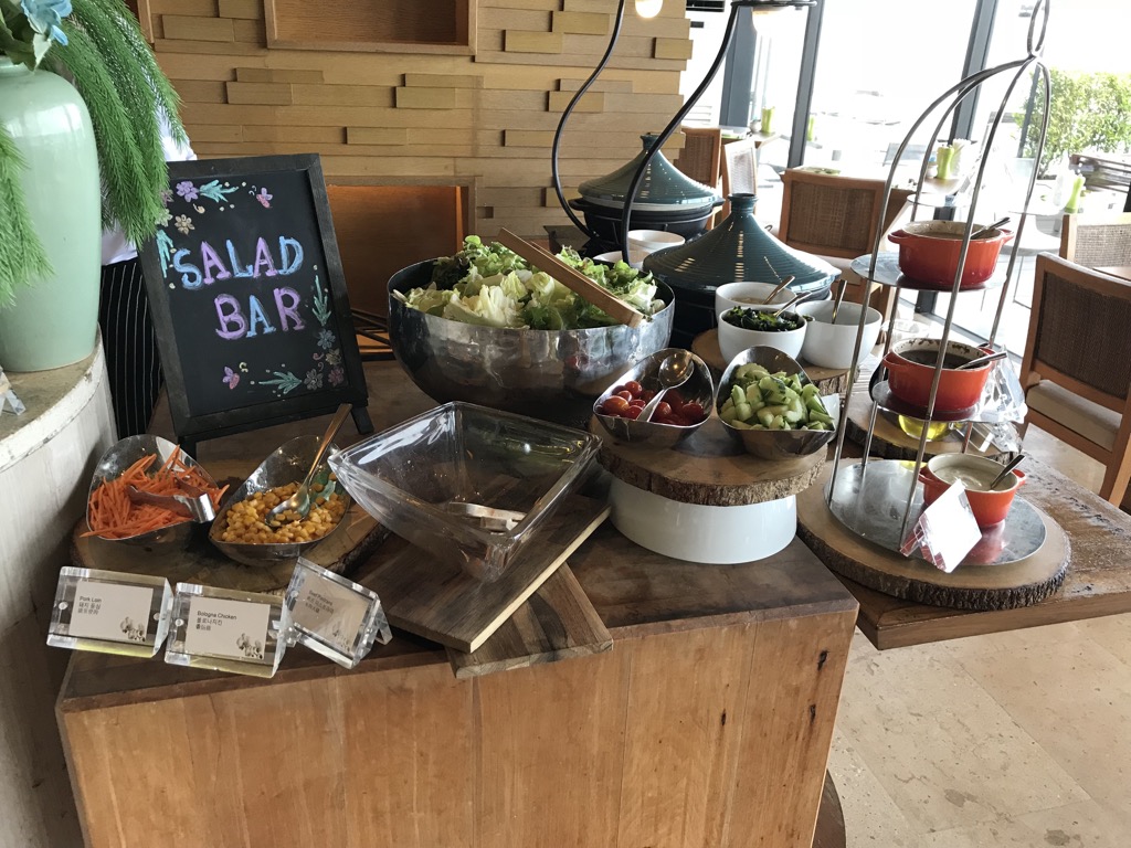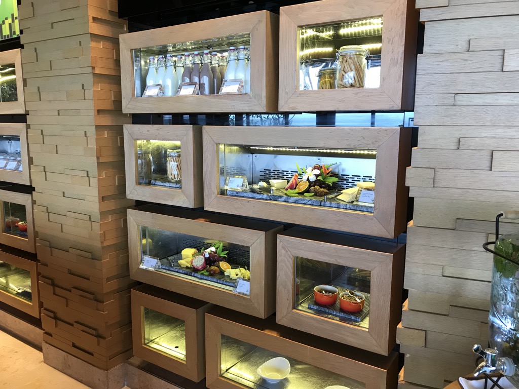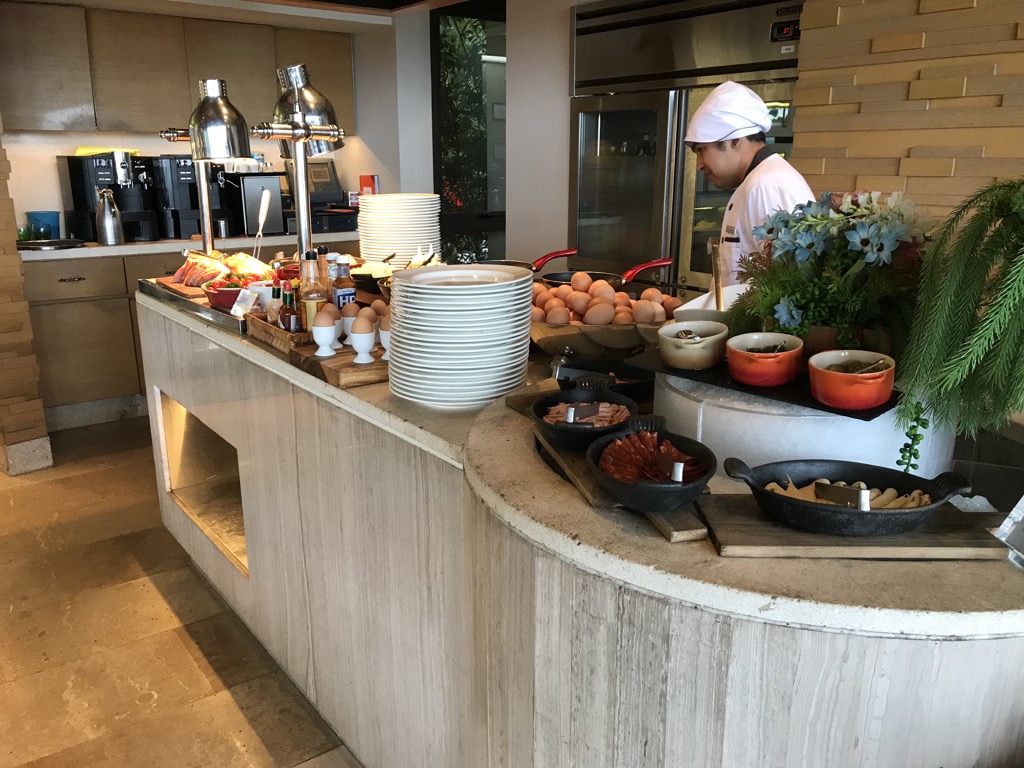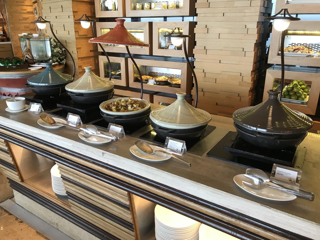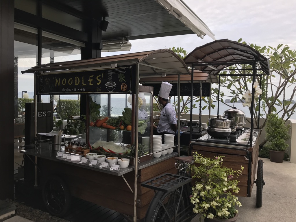 Neben einer Auswahl an frischen Backwaren, täglich wechselnden asiatischen und westlichen warmen Speisen, frischem Obst, Aufstrichen/Auschnitt und Müsli gab es auch noch verschiedene Stationen mit Köchen.