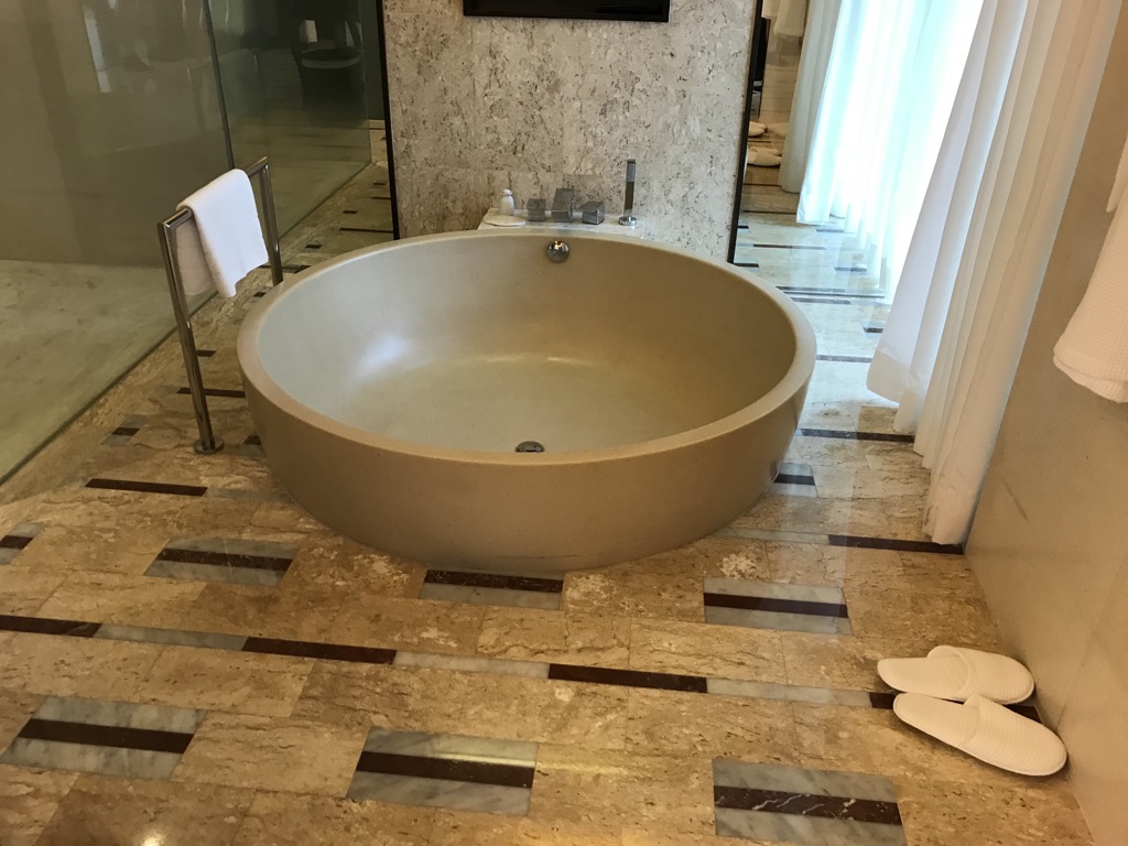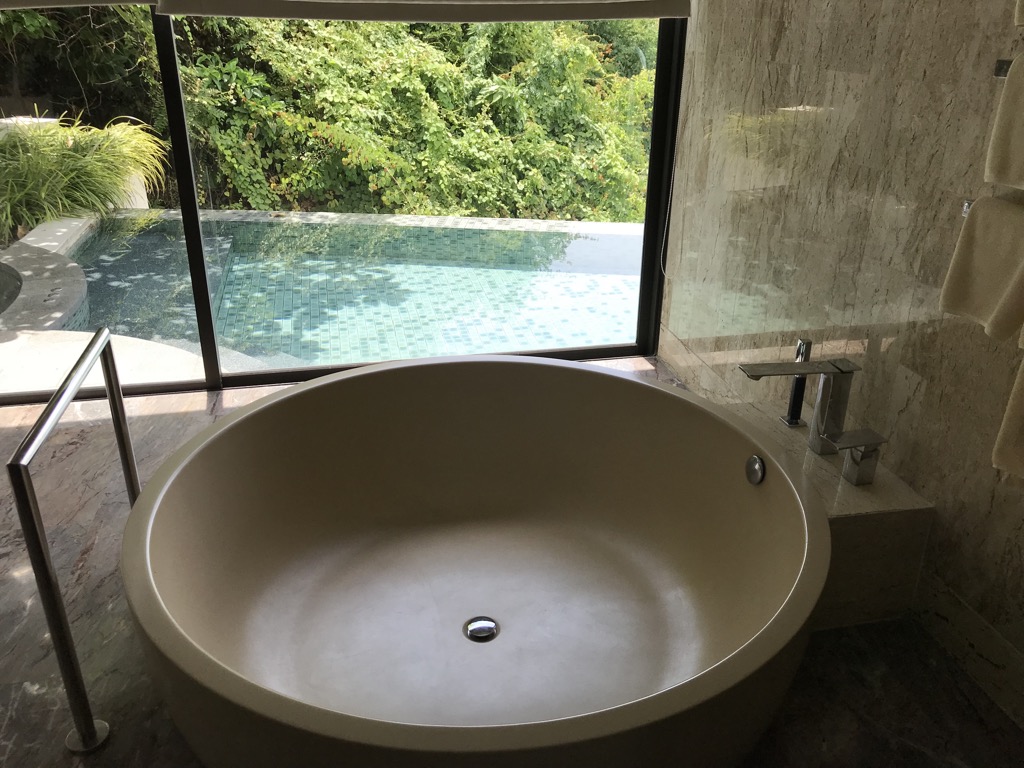 Neben dem großzügigen Wohnbereich verfügte die Villa über ein fast ebenso großes Bad. Das Bad war mit einem großen Waschbecken ausgestattet, das viel Ablagefläche bot (das hätte Tim gefallen ;)). Neben einer großen Dusche mit Regenduschkopf gab es noch eine separate Toilette und eine große runde Badewanne. Auch von der Badewanne aus hatte man bei geöffneten Vorhängen einen wunderbaren Blick auf den Pool und das offene Meer.