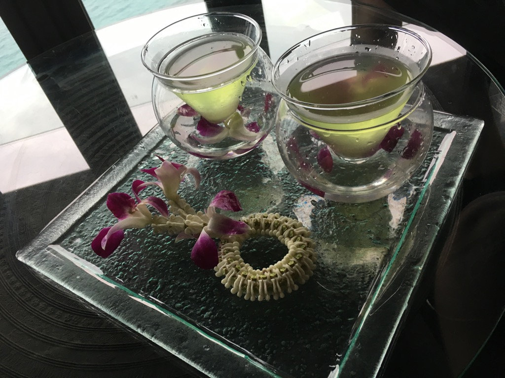 Wir wurden sehr freundlich begrüßt und unser Gepäck wurde sich direkt gekümmert. Während eine Mitarbeiterin mit den Formalitäten began nahmen wir an der Fensterfront Platz und genossen unseren Welcome-Drink. Der Check-In Vorgang verlief zügig, so dass wir bald mit Buggy in Richtung Villa aufbrechen konnten. Auf dem Weg dorthin bekamen wir von einer freundlichen Mitarbeiterin eine kleine Resort-Führung. Uns wurden alle wichtigen Punkte gezeigt und erklärt.