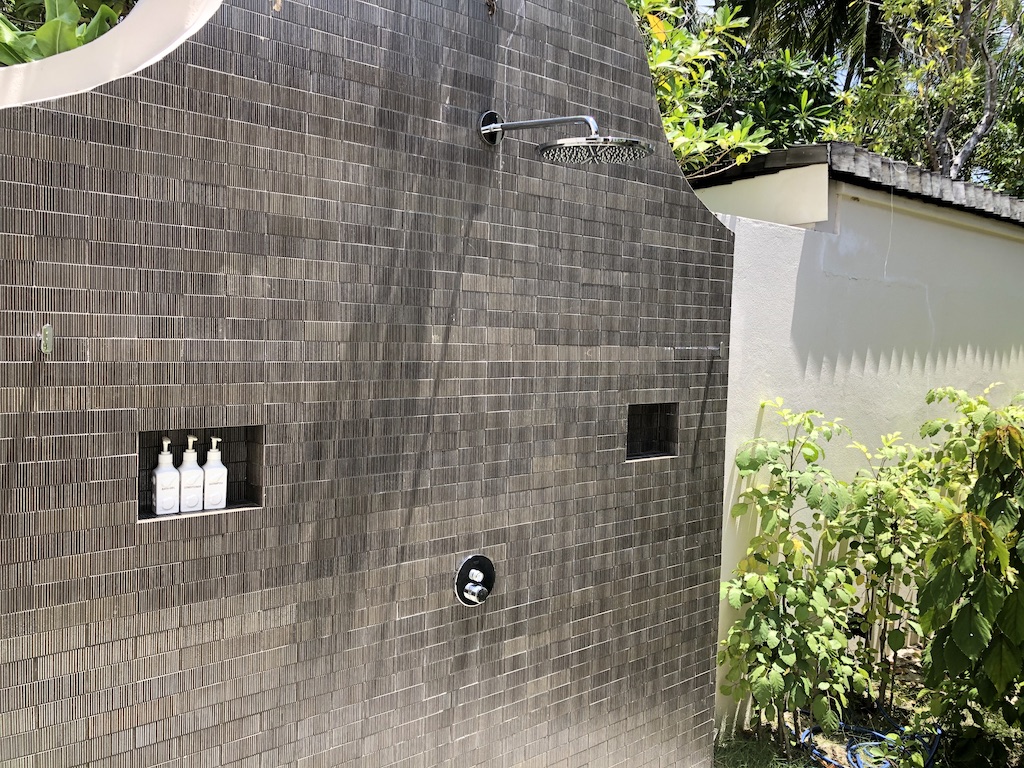 Zwischen den beiden Gebäuden gibt es eine Außendusche, das Badezimmer im Haupthaus wird geteilt. Dort befindet sich noch eine weitere Dusche.