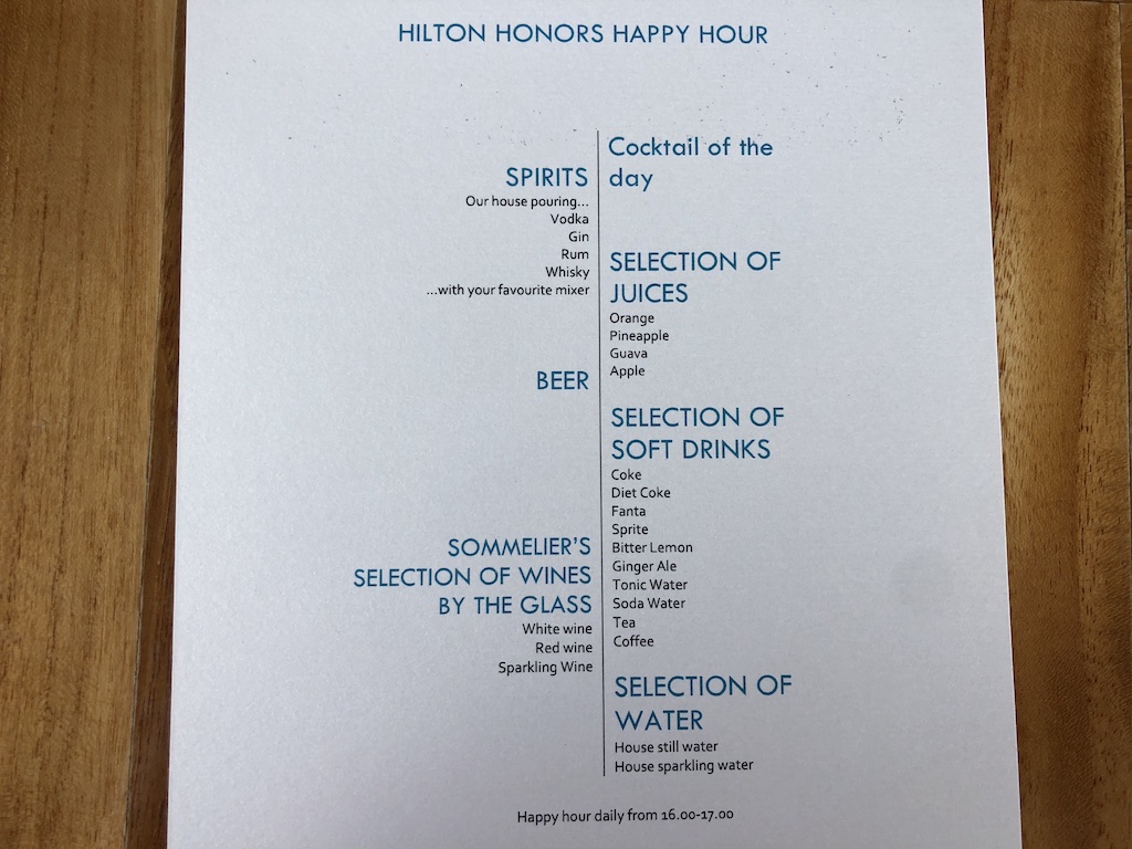 Täglich zwischen 16 Uhr und 17 Uhr gibt es eine Happy Hour mit kostenlosen Drinks und kleinen Snacks. Das Getränkesortiment beinhaltet Sekt, Wein, Bier, einen Cocktail des Tages oder Spirituosen, Mixgetränke sowie Softdrinks.