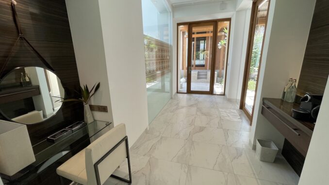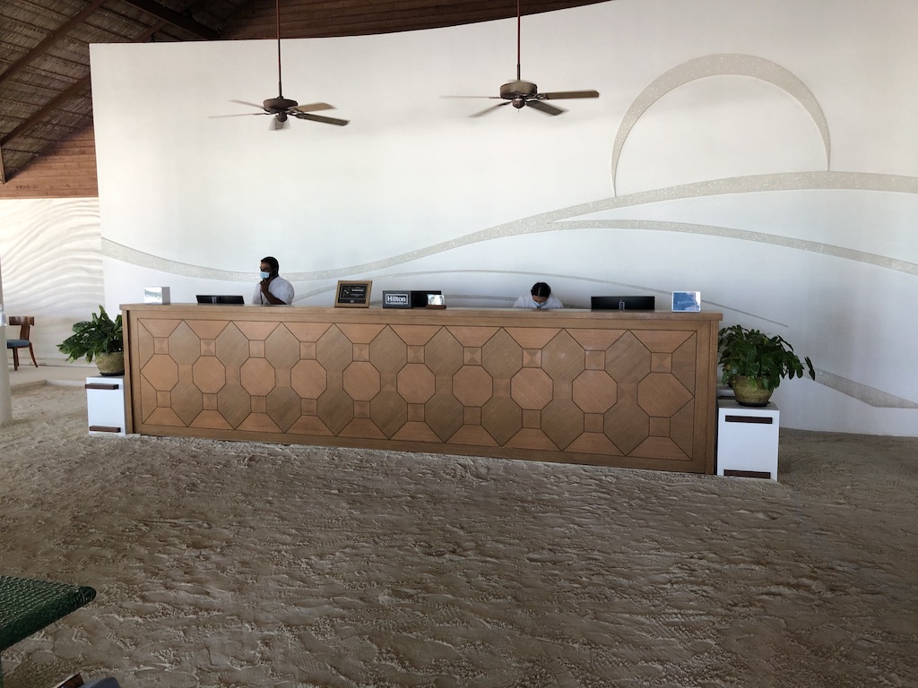 Bis die Villa vorbereitet wurde, haben wir in der Lobby gewartet. Man kann sich überall barfuß bewegen, selbst vor der Rezeption liegt Sand.