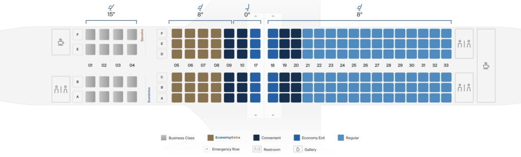 Der Sitzabstand in Reihe 18 ist großzügig und im Vergleich schon beinahe luxuriös. Die Kabine ist in zwei Klassen aufgeteilt, in der Business Class befinden sich Recliner-Sitze in einer 2-2 Konfiguration, die Economy ist ganz klassisch 3-3 bestuhlt. Das neueste Bordprodukt mit flachen Betten in der Business gibt es nur auf der 737MAX.