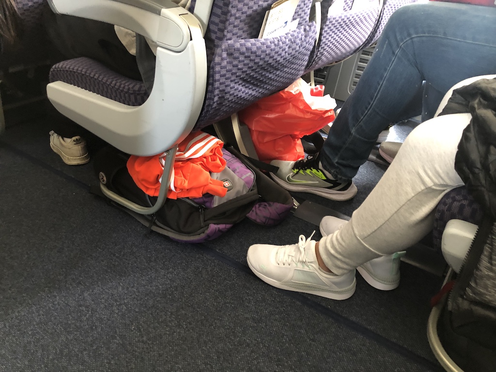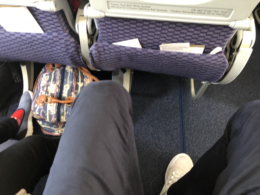 Die Ablagefächer waren bereits prall gefüllt und geschlossen, trotz der Sitze am Notausgang konnten wir unser Gepäck dort auch unter dem Vordersitz verstauen. Normalerweise ist dieser Bereich tabu für Taschen und Koffer, Copa hat hier – wie viele US-Carrier auch – offenbar eine andere Regelung.