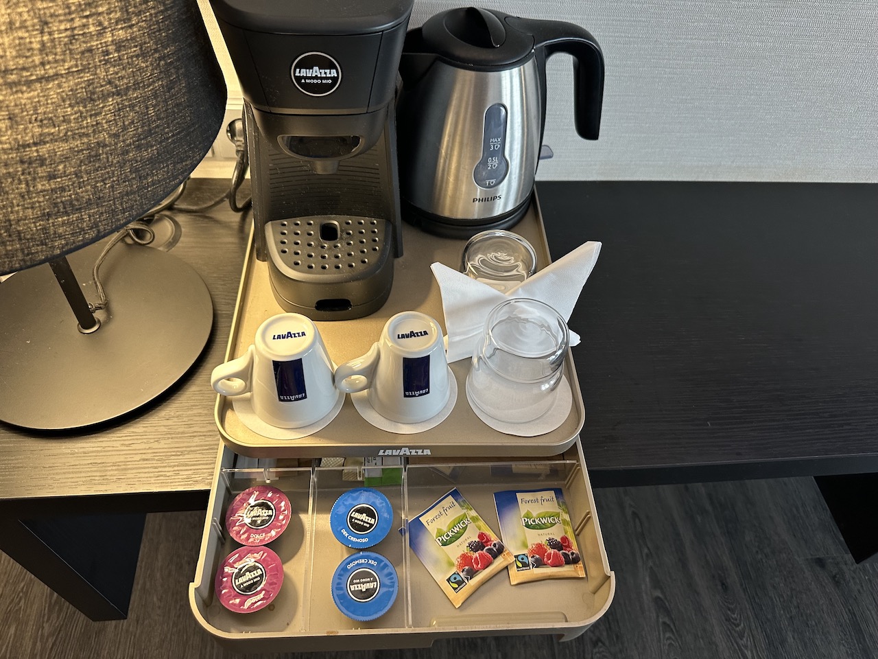 Darauf stand eine Kapselmaschine für Espresso und ein Wasserkocher.