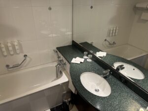 Vermutlich wollte das Management ursprünglich Conditioner anbieten, der aber in Europa ja aus „Nachhaltigkeitsgründen“ ausstirbt (in DE überall ausgelistet bei den Drogeriemärkten, enthält „Gift“) und am Waschtisch fehlt halt der 2te Halter. Also macht man die Bodymilk halt in die Duschkabine…. Wow!