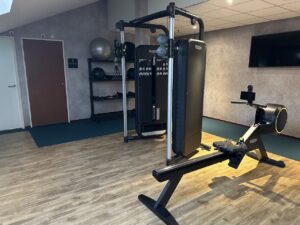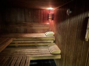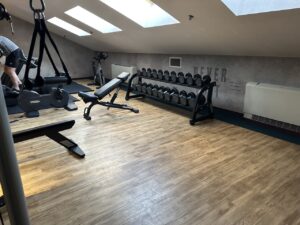 In der vierten Etage ist ein Gym mit einigen Trainingsgeräten, im Nebenraum sind Trockensauna samt Duschen und Schließfächer.