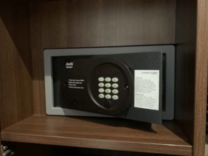 In der Garderobe im Gang zum Wohn- und Schlafbereich befand sich ein Safe, sowie Bügeleisen- und Brett.